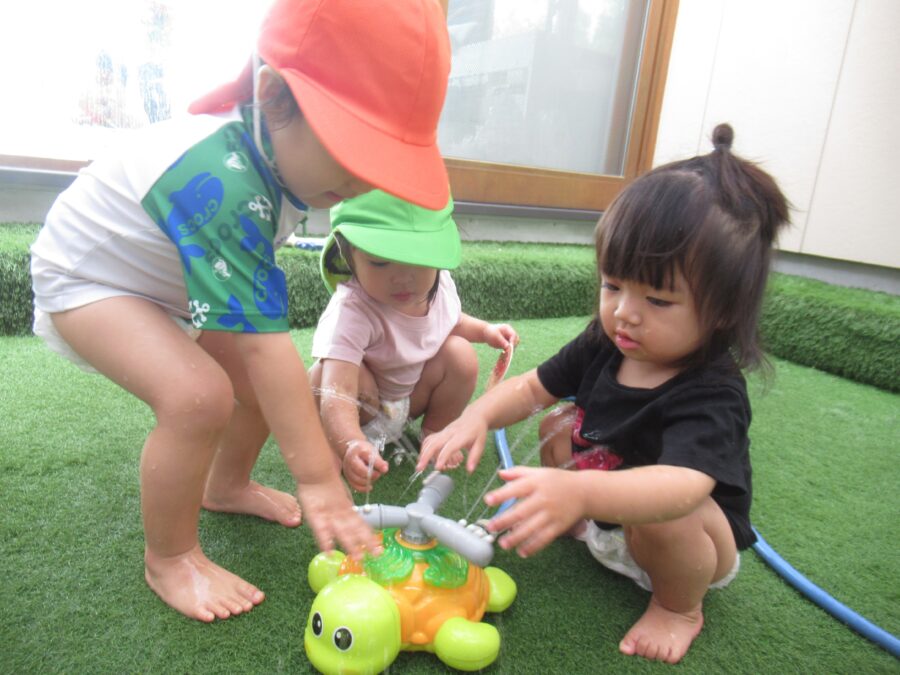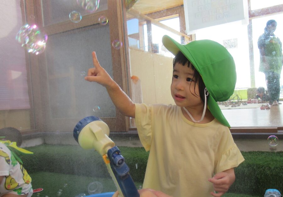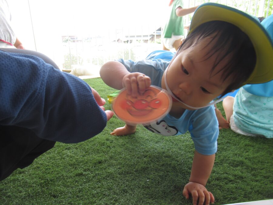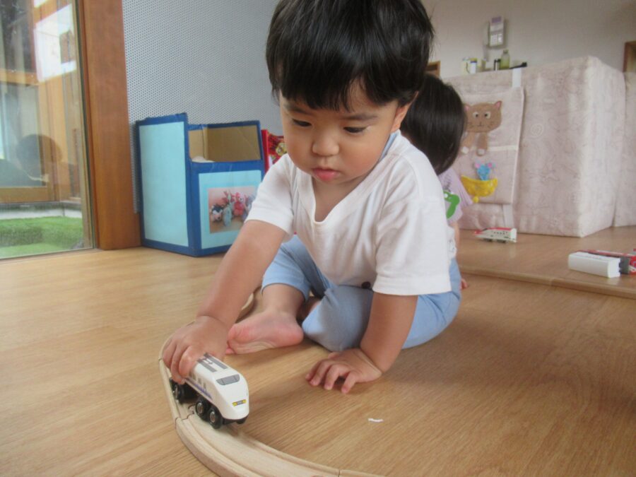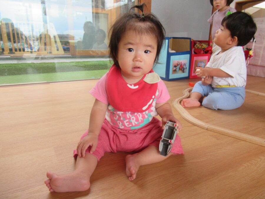 電車を片手に、カメラを持っている保育者の事を見つめていました![]()