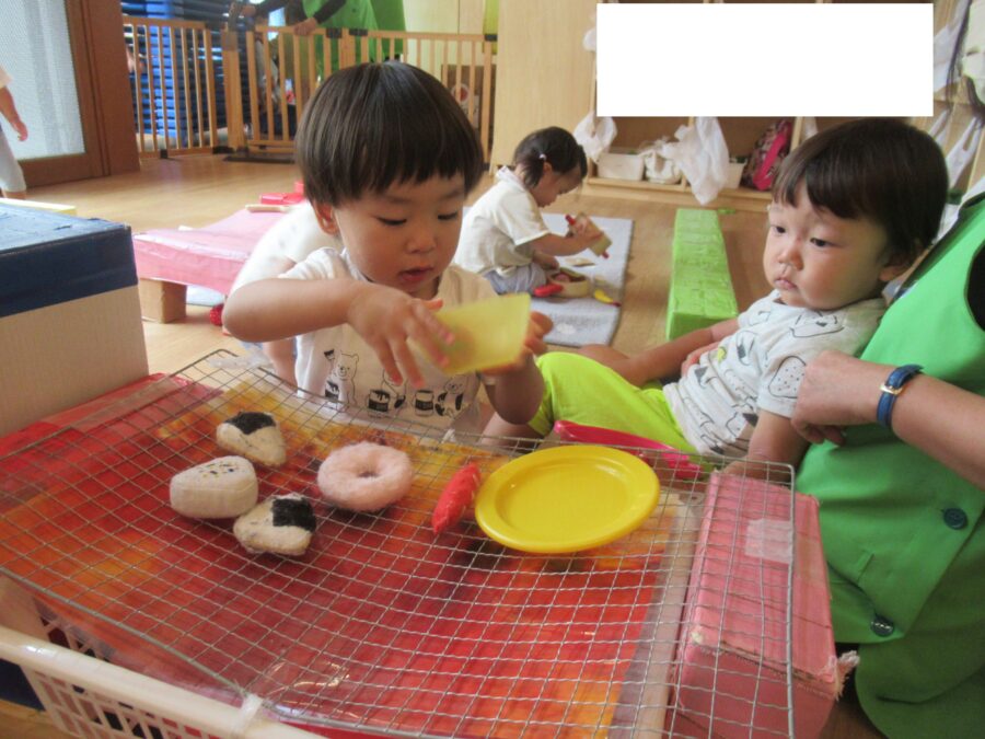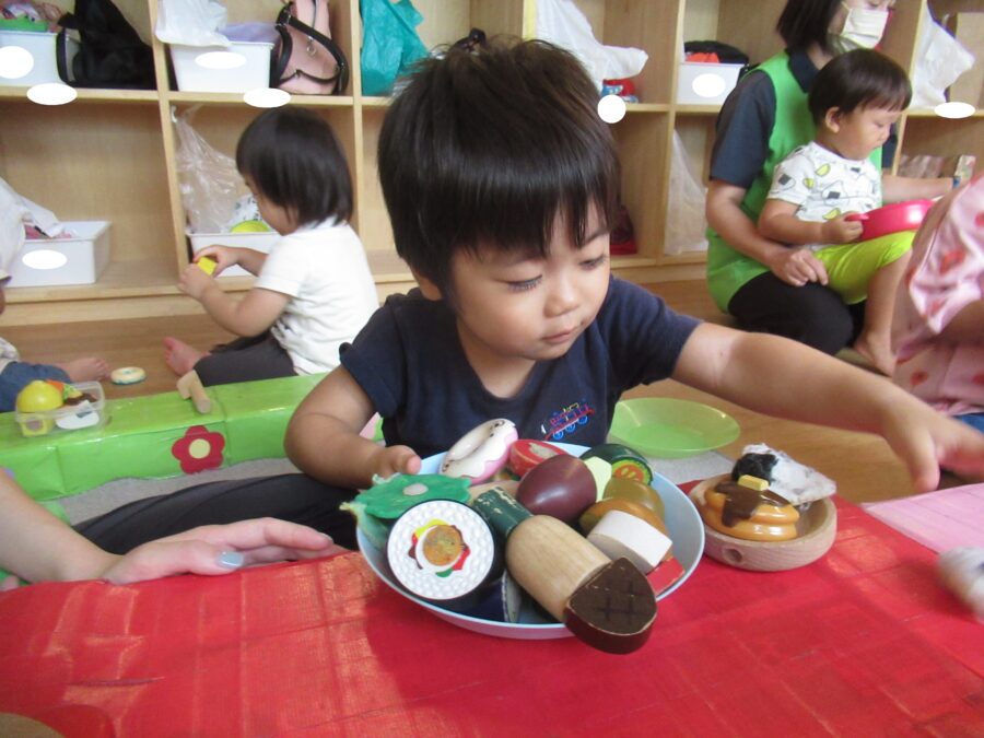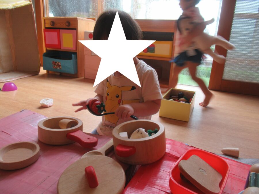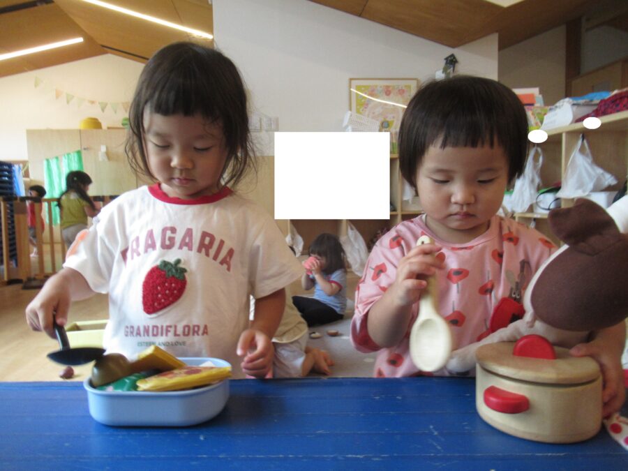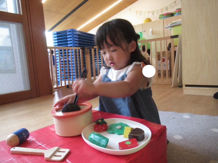 おままごとコーナーでは、バンダナを持ってきて頭につけて~と持ってきていました![]()