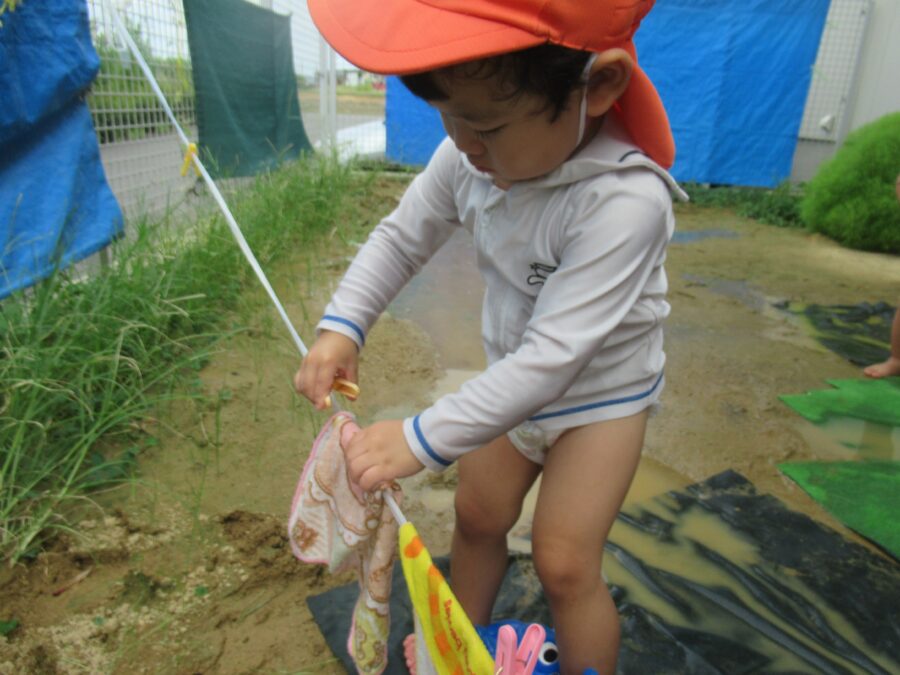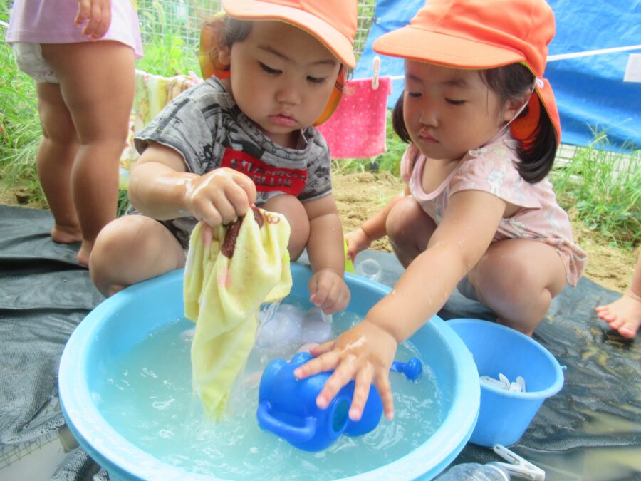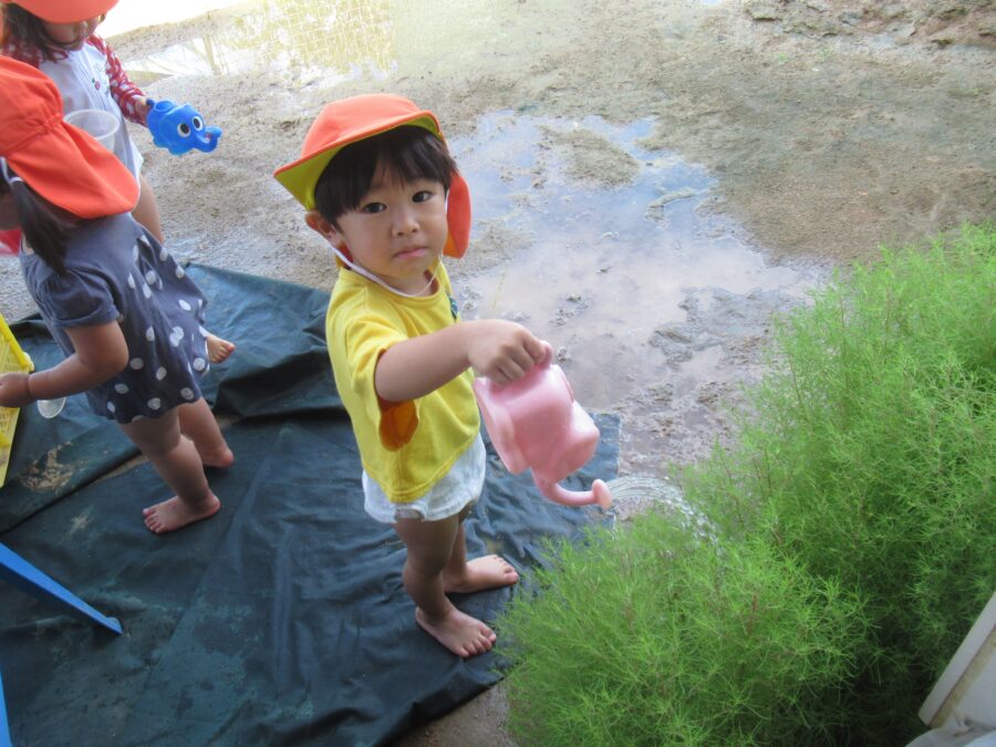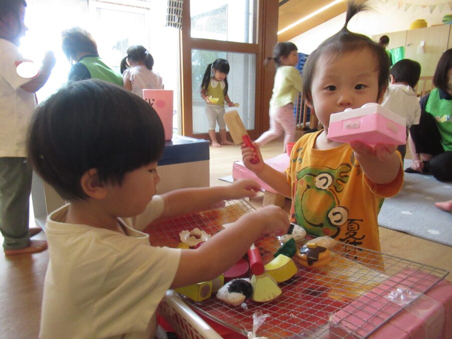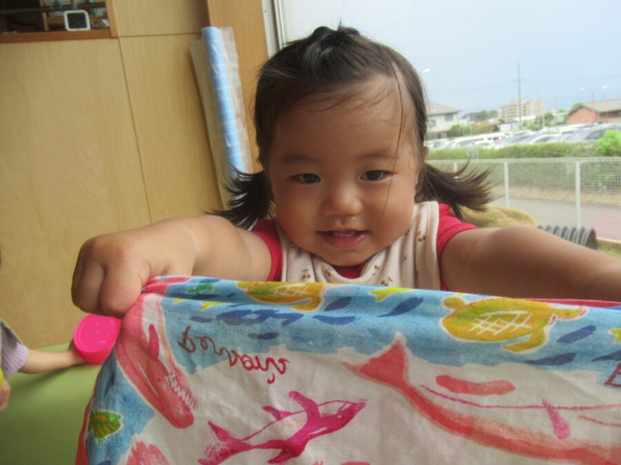 おままごとコーナーでは、バンダナを持ってきて頭につけて~と持ってきていました![]()