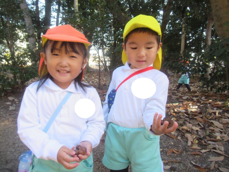 道中の神社ではどんぐり探しに夢中の子どもたち
