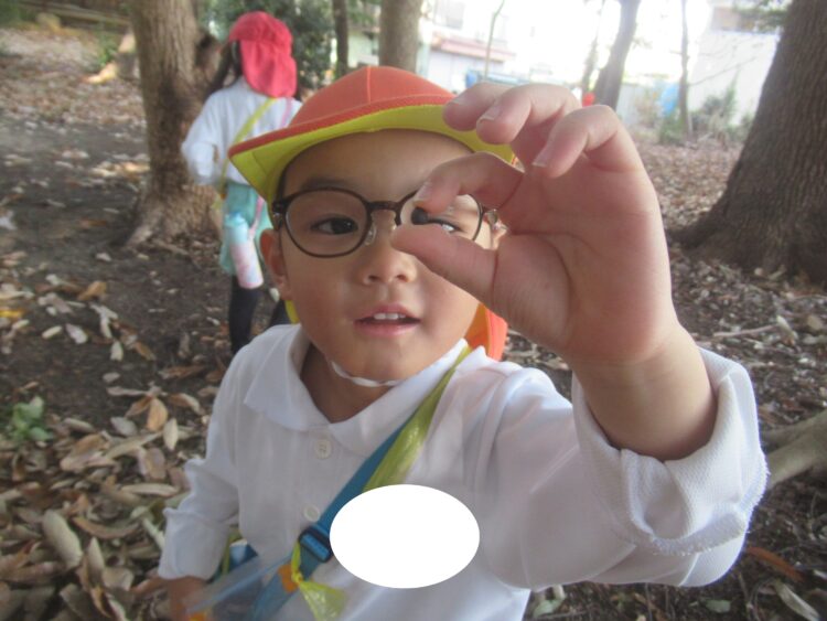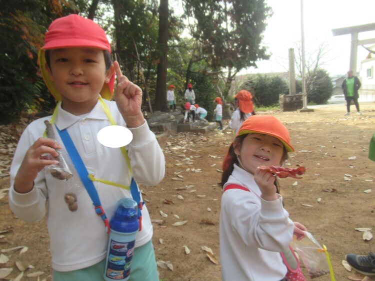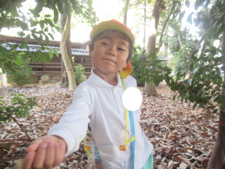 顔より大きな葉っぱやどんぐりを集めていい笑顔ですね✨