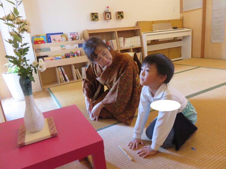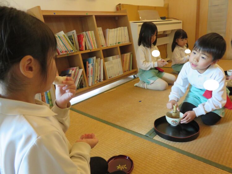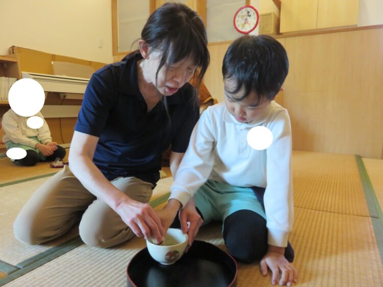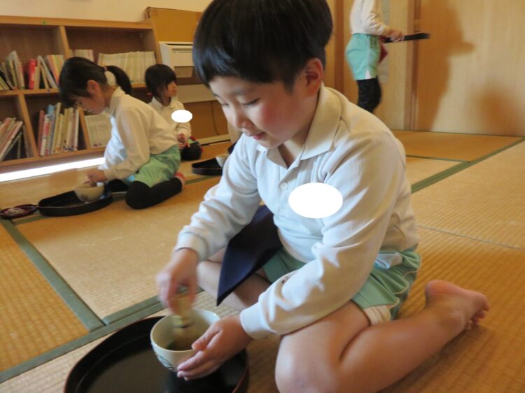 お友だちの表情を見ながら丁寧にお茶をたてるお友だち✨