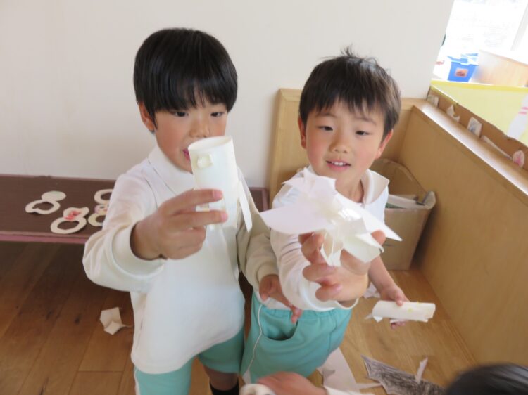 男の子たちはトイレットペーパーの芯で動物を作っていました!