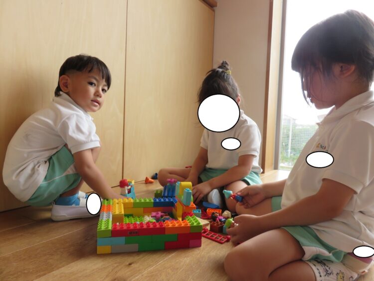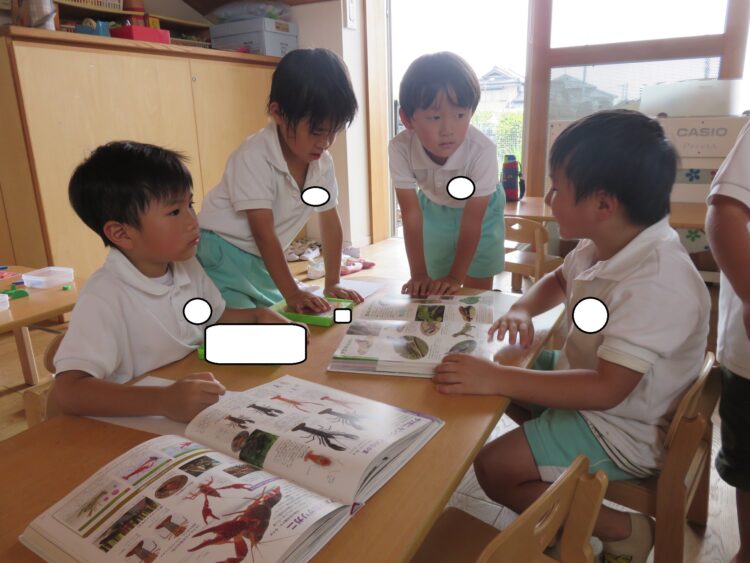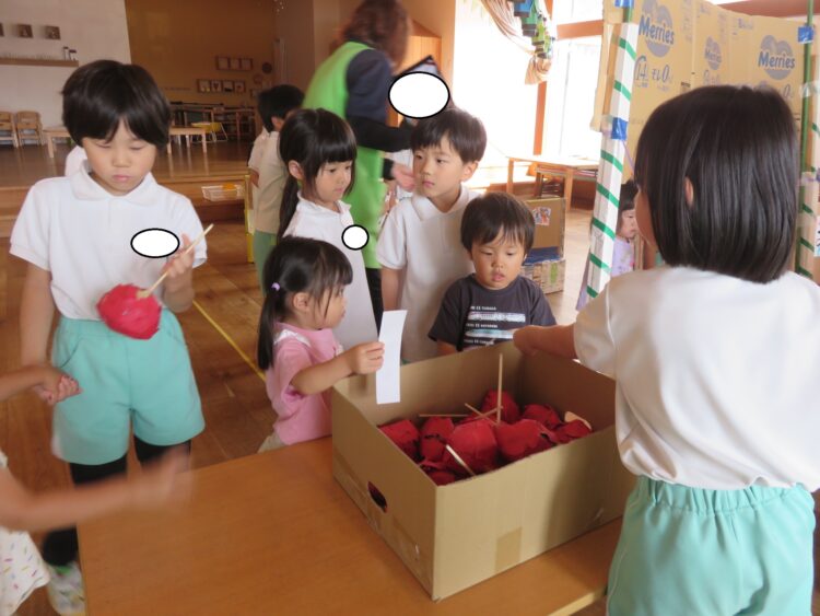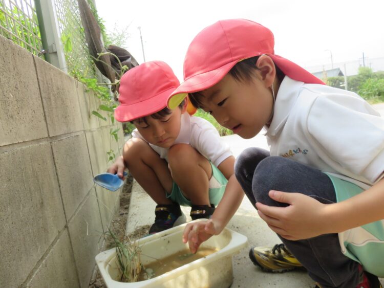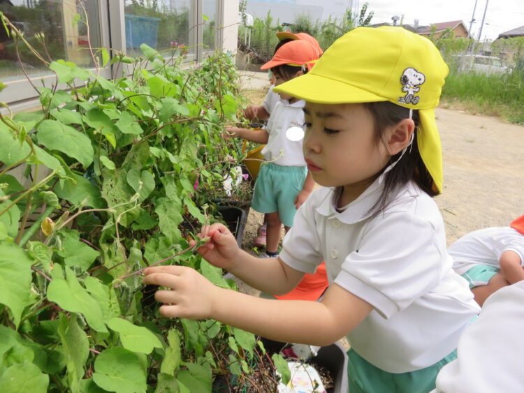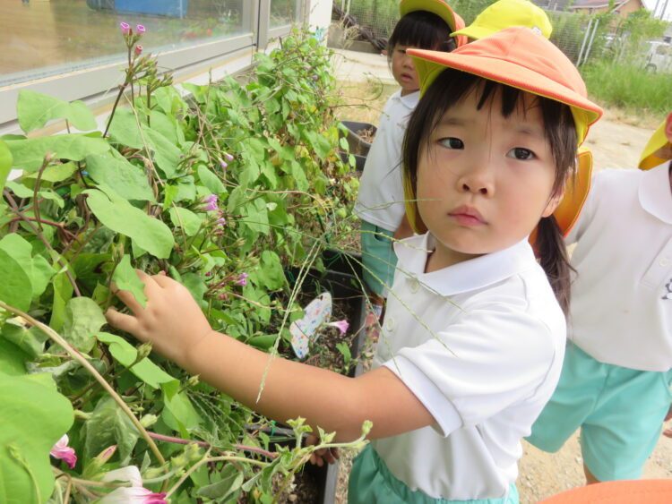保育者が枯れたお花を選んで摘むように声を掛けると「先生、これはいい?」と確かめながら、しぼんだお花を一生懸命探し、見分けていました