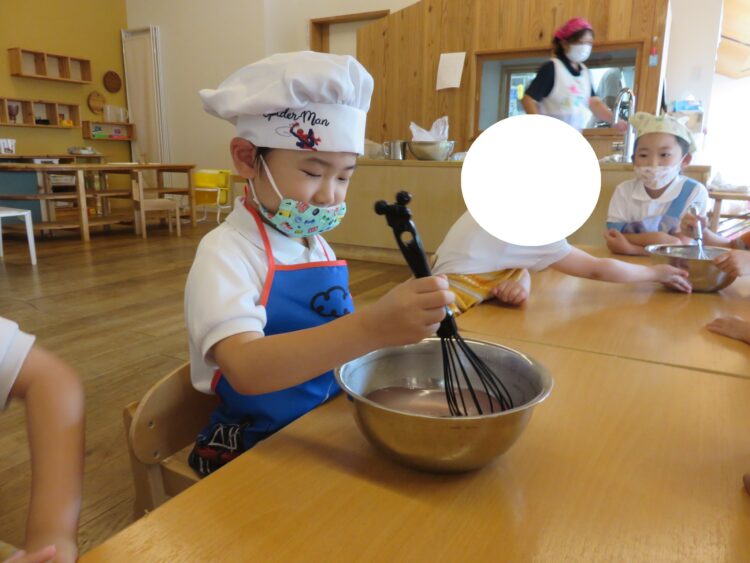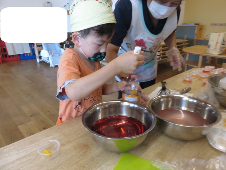 ゼラチンを入れてかき混ぜたり、カップに流し込んだり、可愛いパティシエさんが愛情込めて作ってくれました