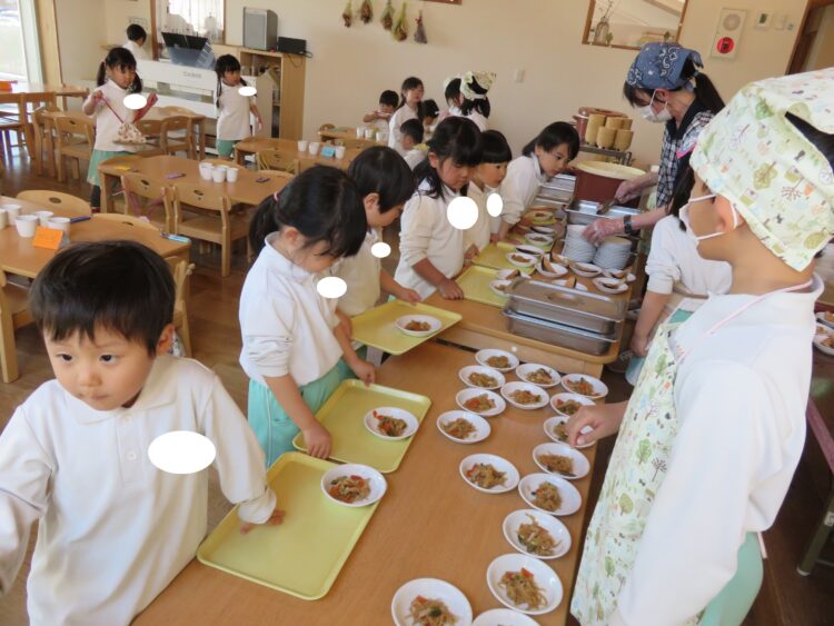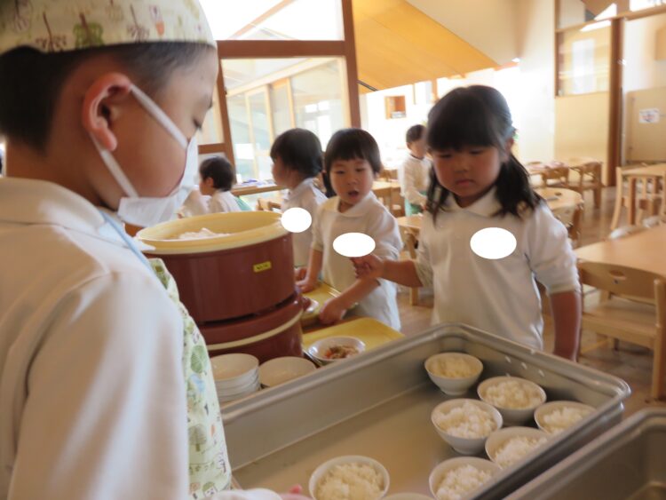 今日の給食は「ごはん、鮭の照り焼き、切干大根の煮物、白菜とわかめの味噌汁」でした。きらきらさん当番さんが配膳をしていましたよ👏