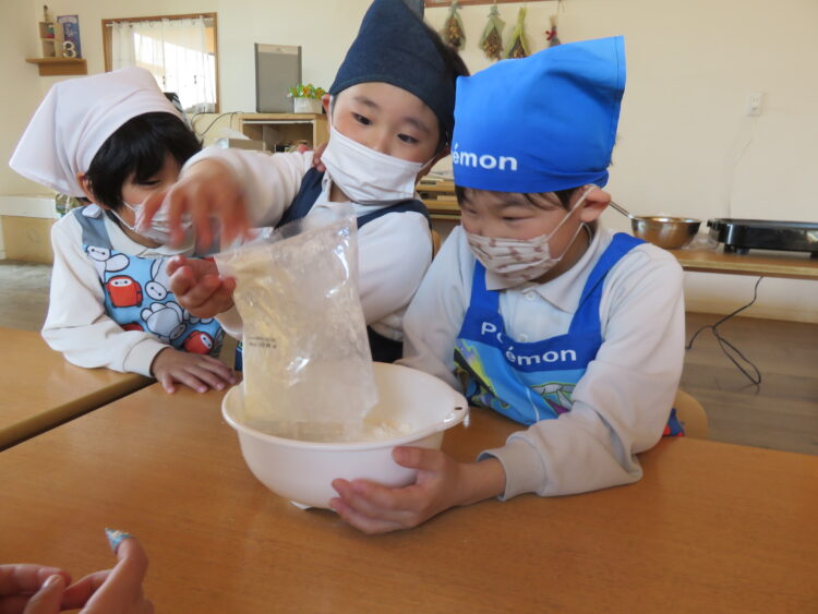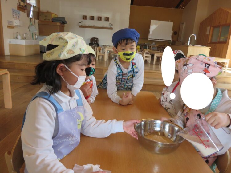 ボールにホットケーキミックス、豆乳を入れて生地作りをしたりと