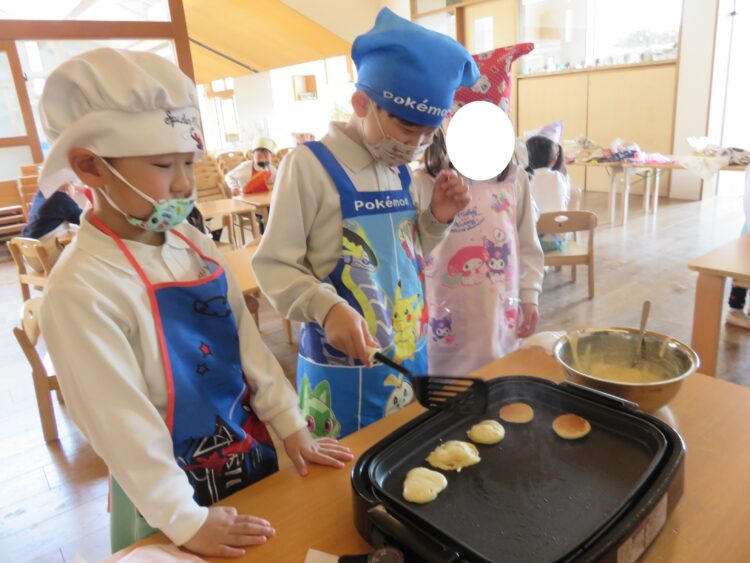 ホットプレートに生地を流して、フライ返しでひっくり返すと「わぁ~~~おいしそう!」とニコニコ笑顔に![]()