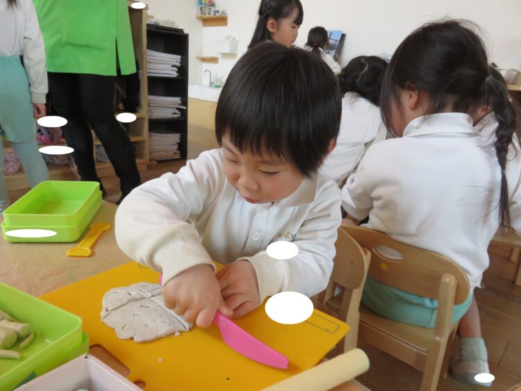 粘土遊びでは、へらを使ってショートケーキを作っているお友だちを発見![]()