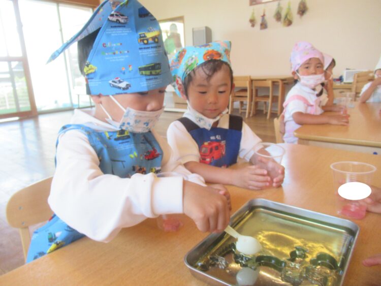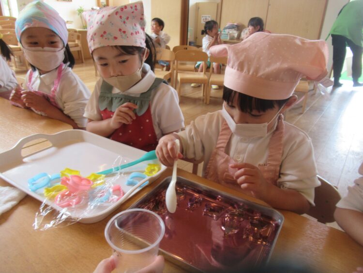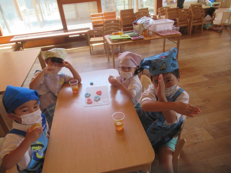 冷やして固まった寒天を色々な形に型抜きしました!