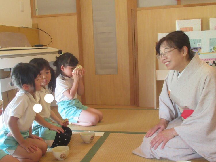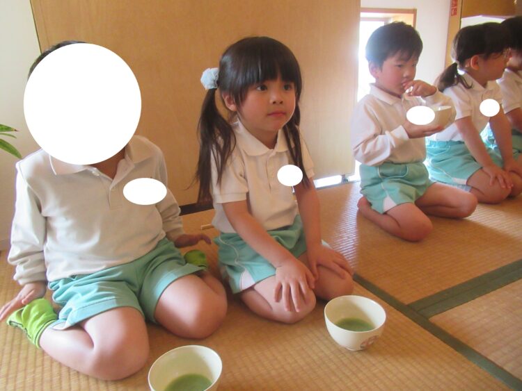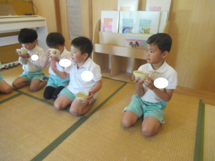 先生に教わりながら少しずつお茶を飲む子どもたち・・・