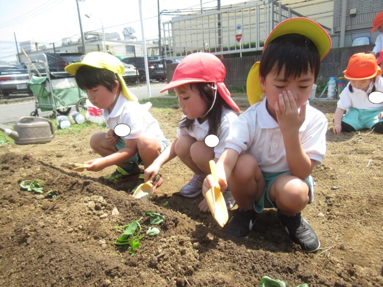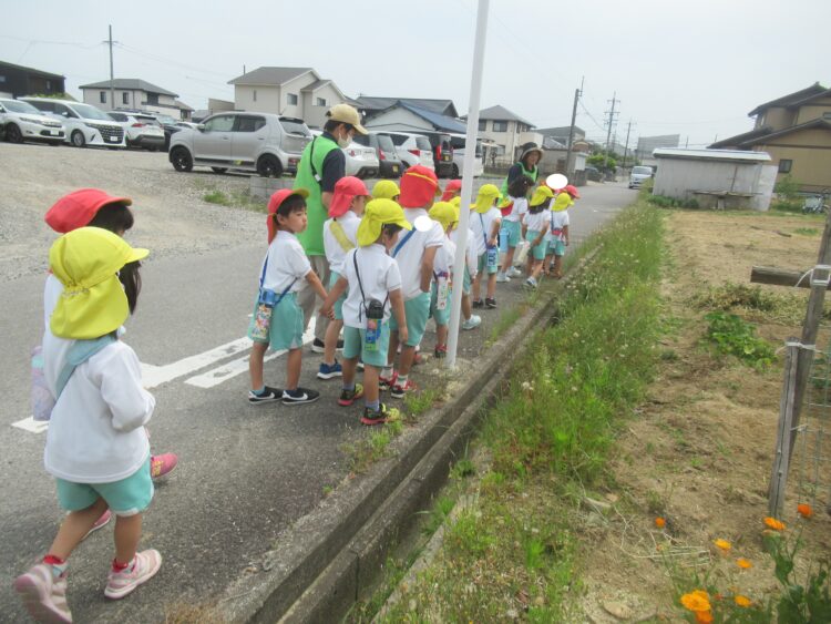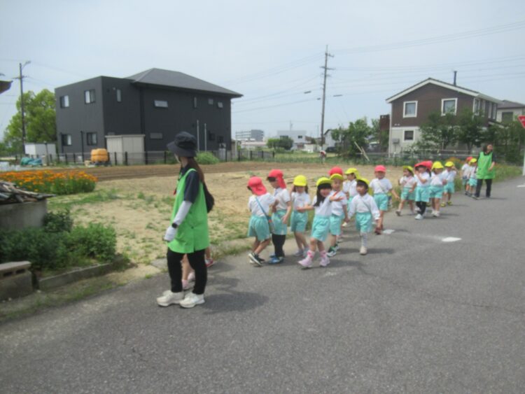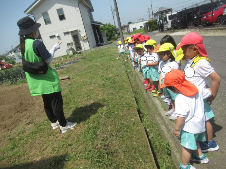 どきどきさん・きらきらさんは、園で夏野菜を育てるために近所の畑を見て観察を行いました
