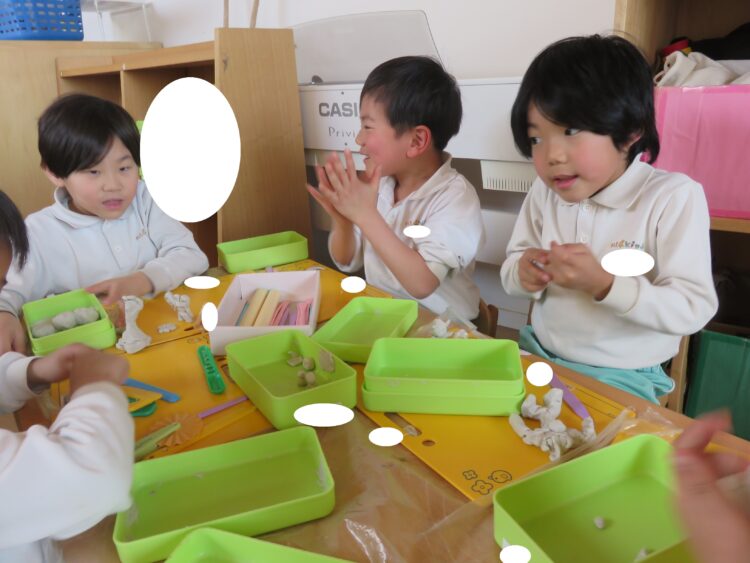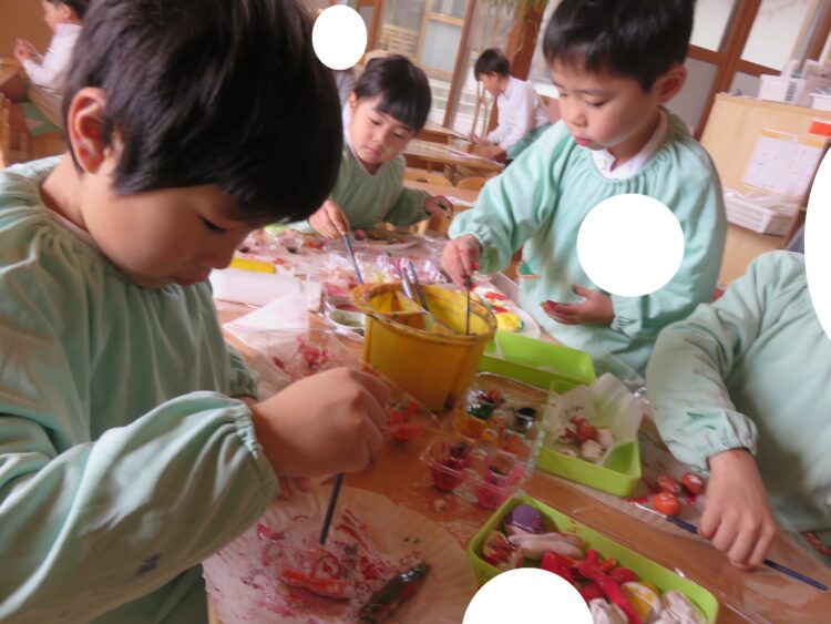 大きな段ボールで製作をしたり、粘土に丁寧に彩色したりと作品作りを満喫しています