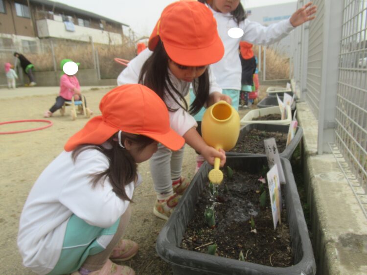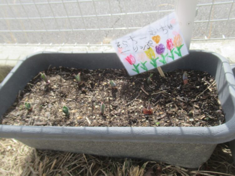 「もうすぐ咲くかなぁ?」とじっくり観察しながら、チュウリップの生長を楽しみにする姿が見られました![]()