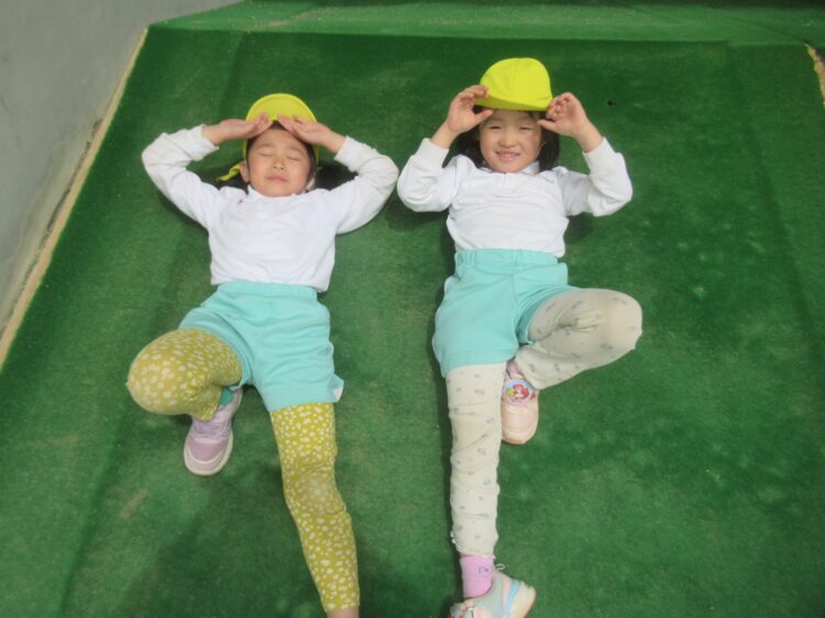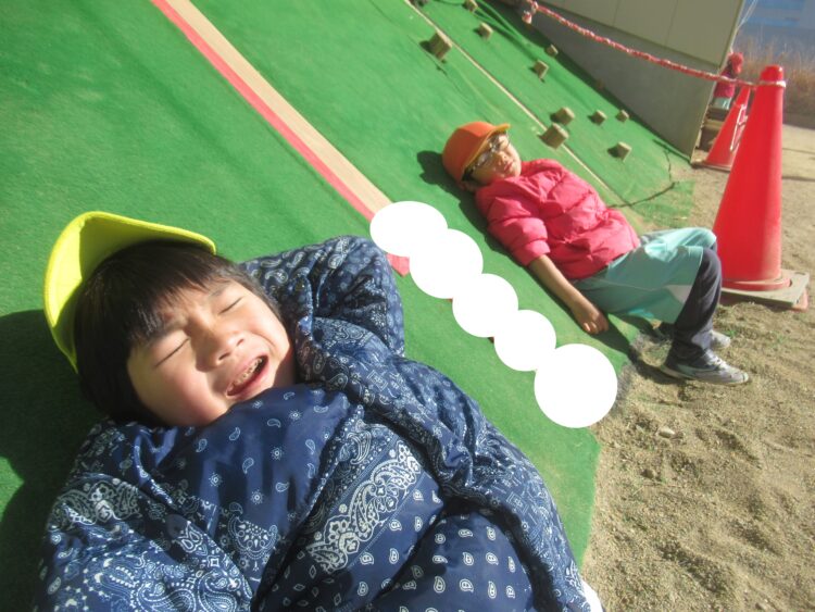 風が強い日中でしたが日差しは暖かく、人工芝で日向ぼっこするお友だちがたくさんいました