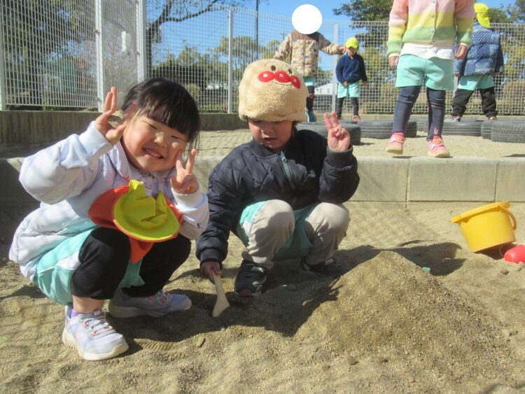 砂場ではお友だちと協力して大きな山を作る子どもたちがいました✨