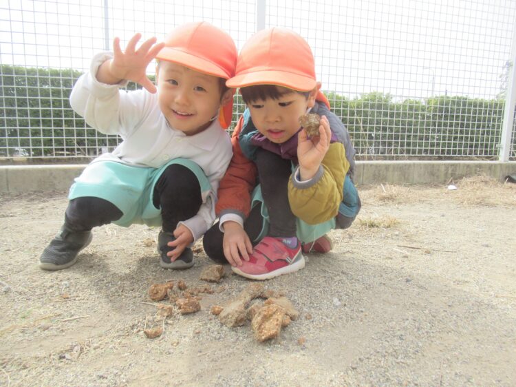 化石発掘のように、大きなかたまりを砕くと「石が出てきた!」と大喜び![]()