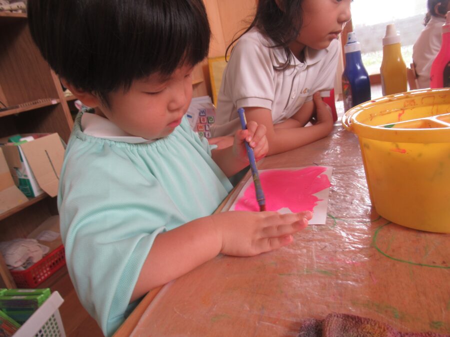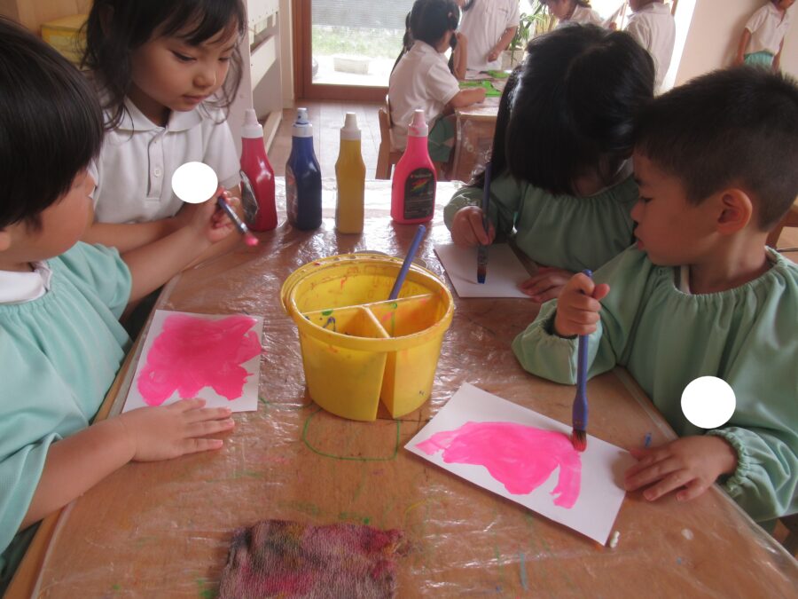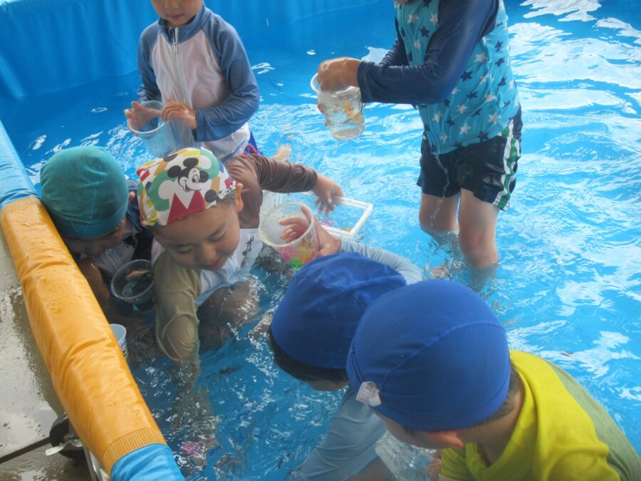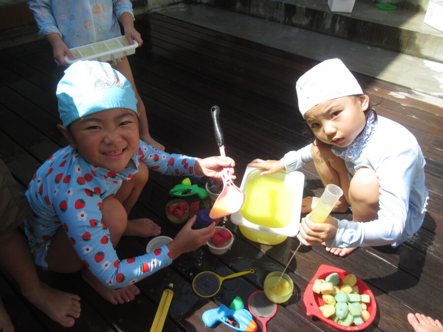 お友だちと混ぜ合って、いろんな色の色水ができていました!