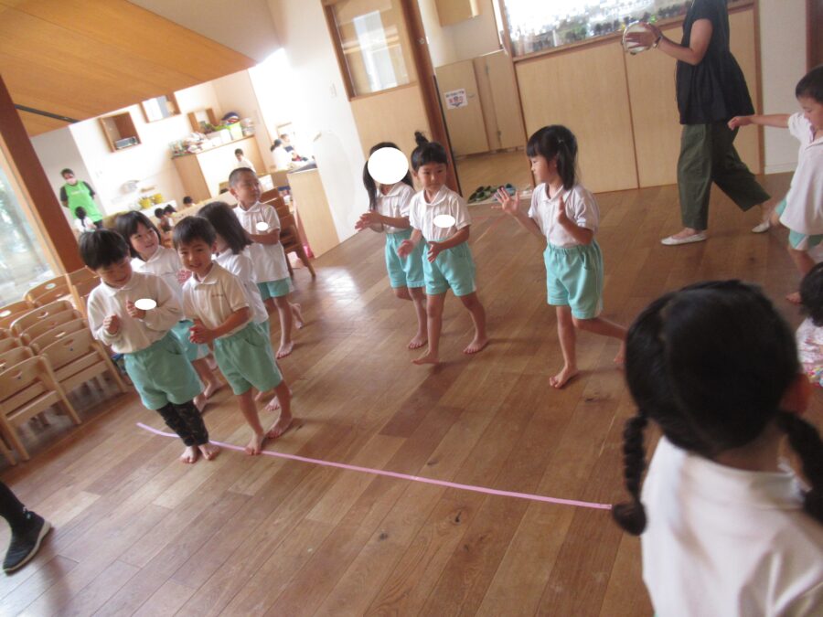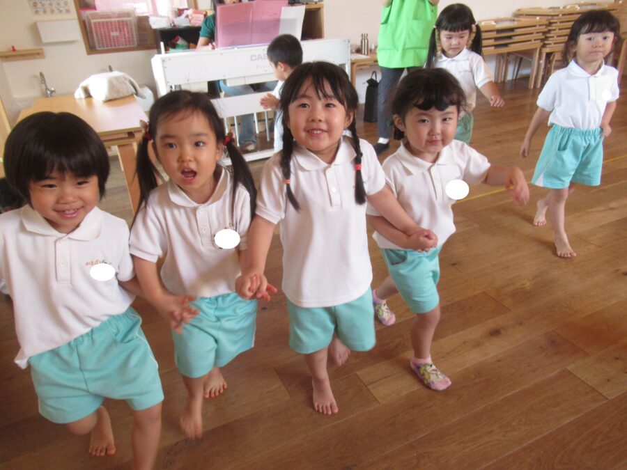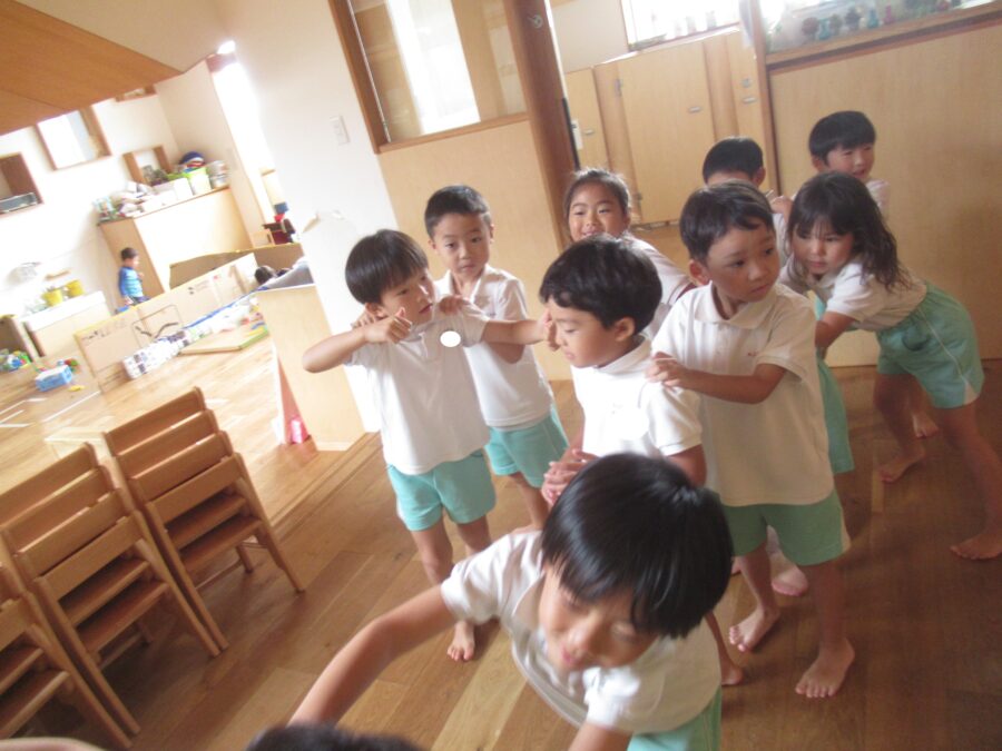 みんなで電車に変身して、音に合わせて歩いたり、止まったり![]()