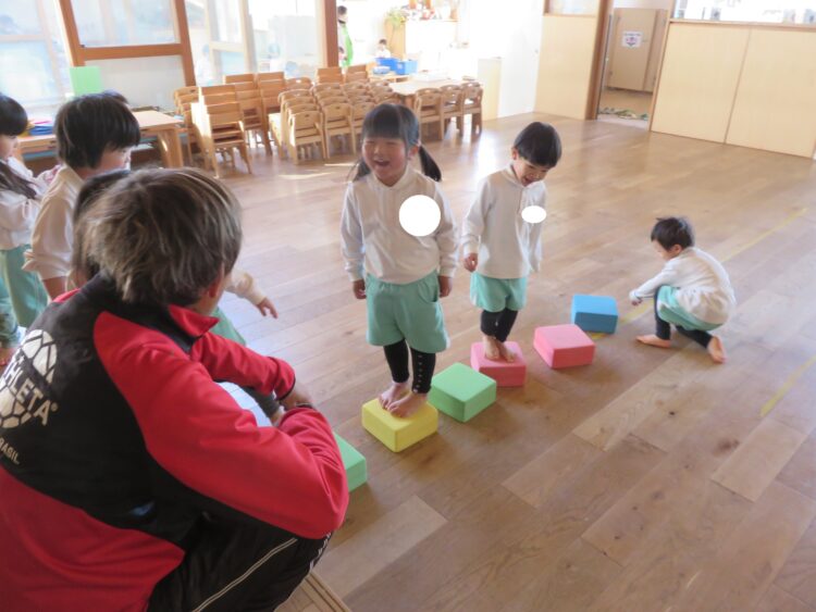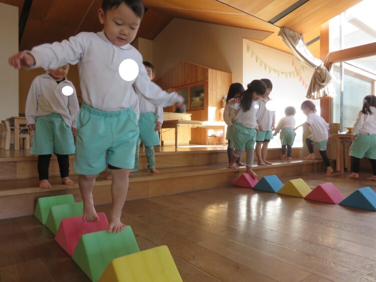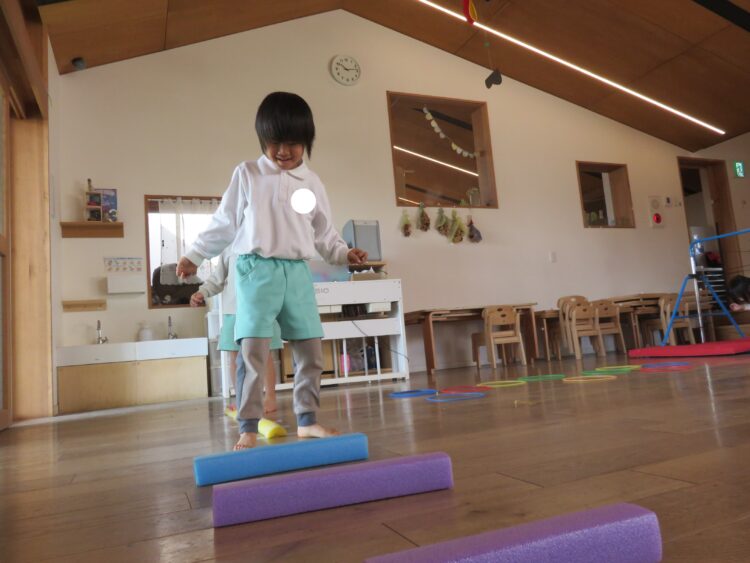 ウレタン積み木の上をバランスを取りながら渡っていました