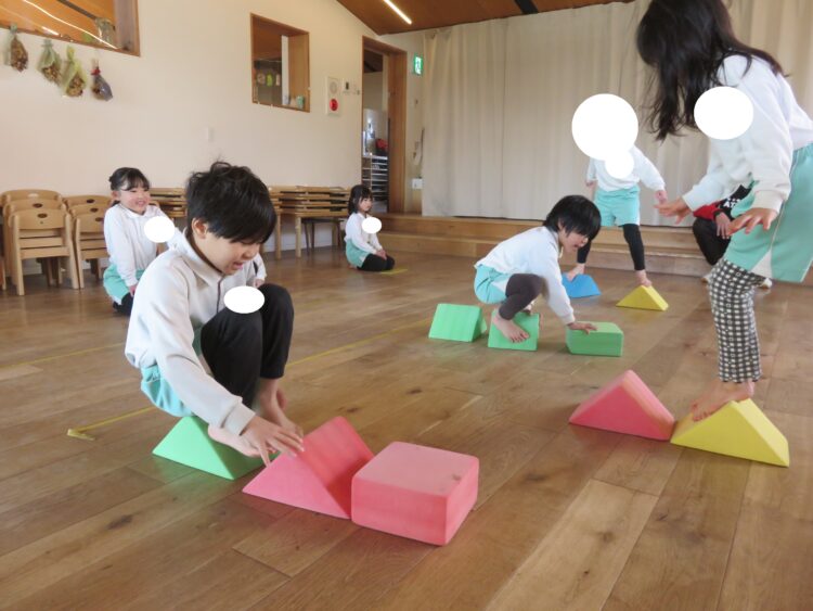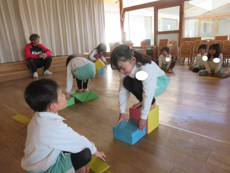 きらきらさんは3個のウレタン積み木を使って、落ちないようにお友だちの元へ移動していました
