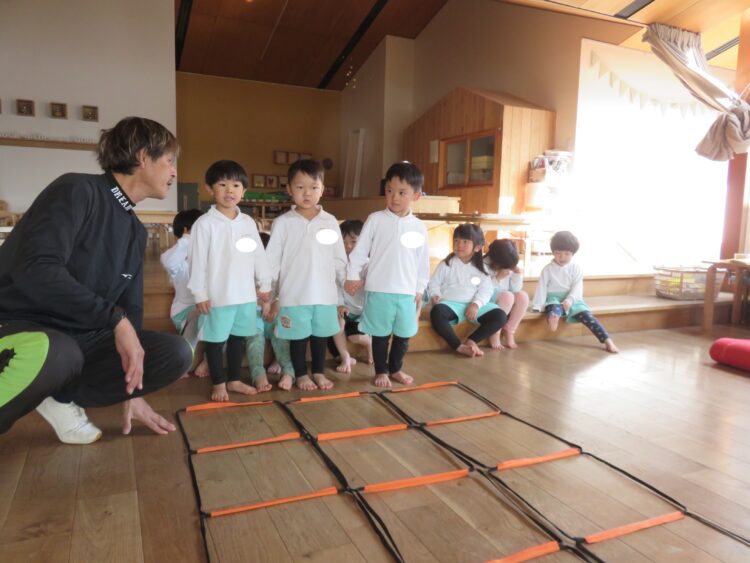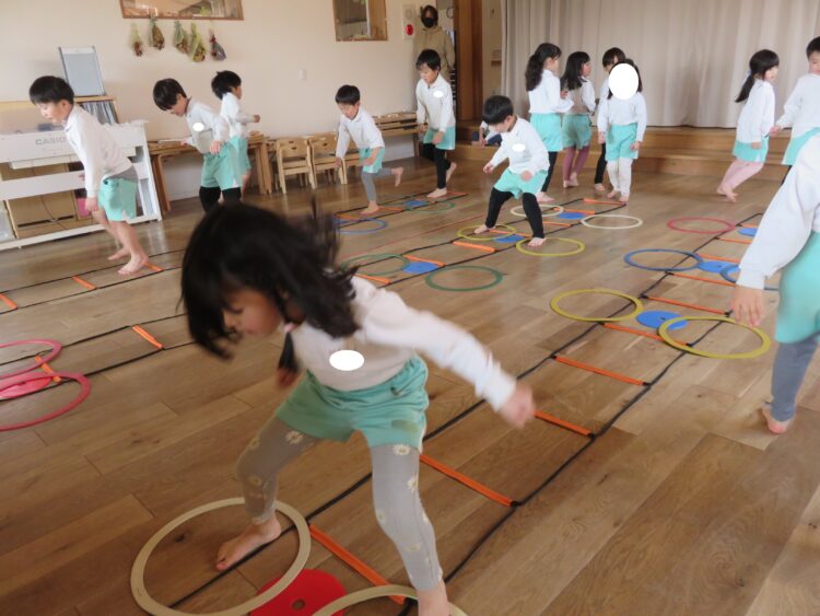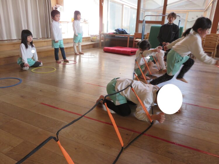 先生の話を聞きながら、ぶつからないようにくぐったり、走ったりと、全身をいっぱい動かして遊びました。
