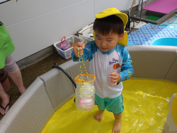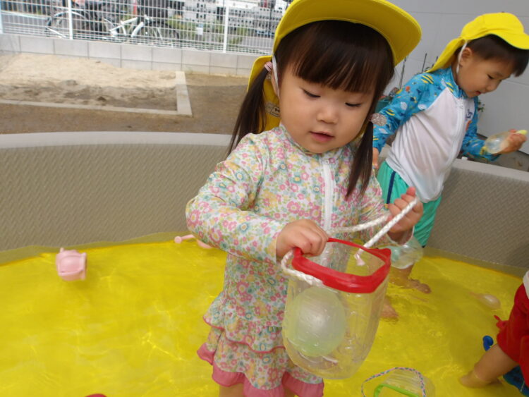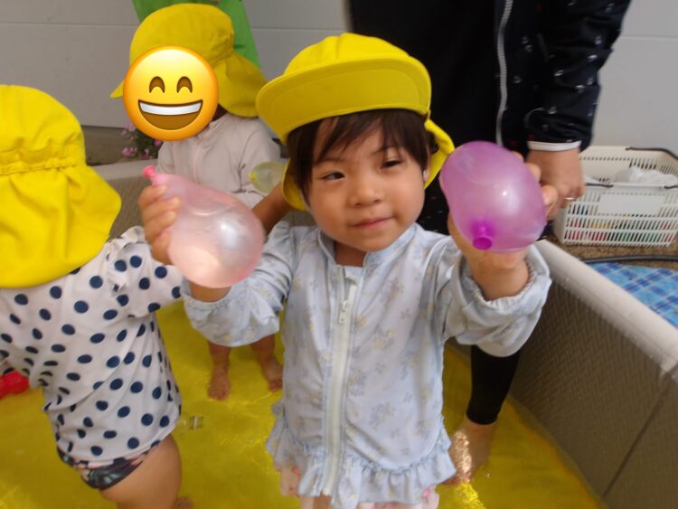今日は水風船で遊びましたみんな、お気に入りの色を見つけ、感触を楽しんでます