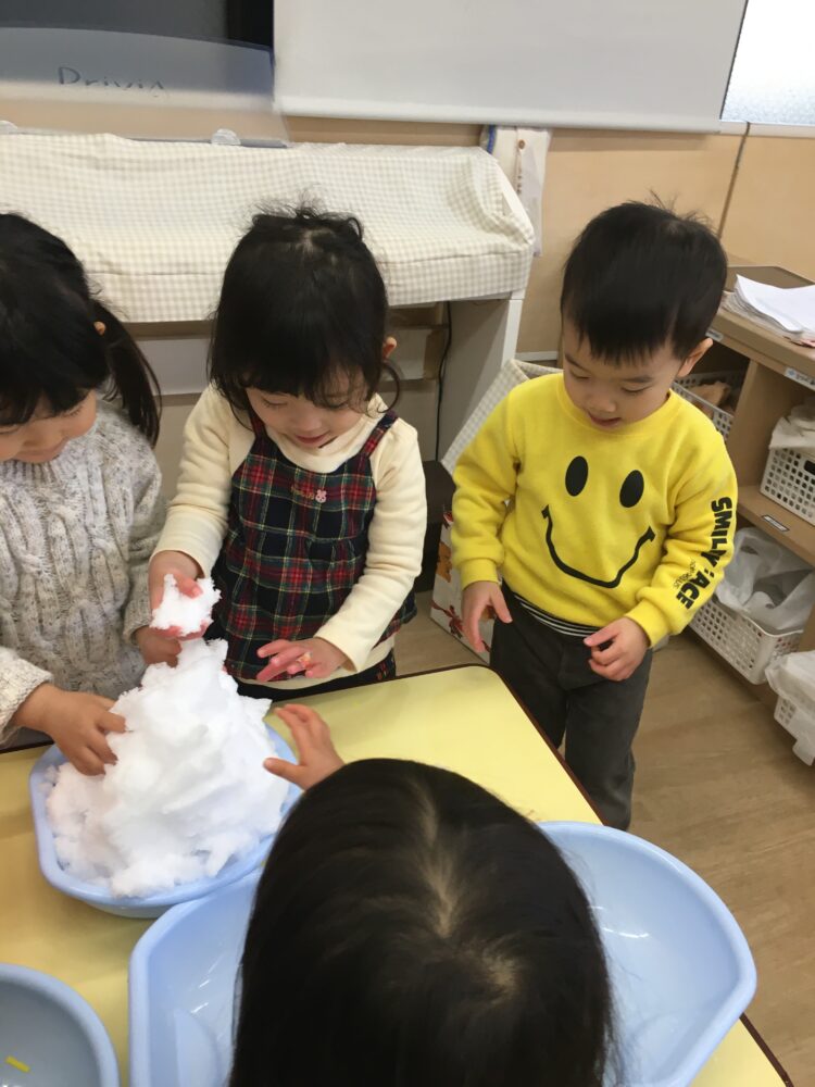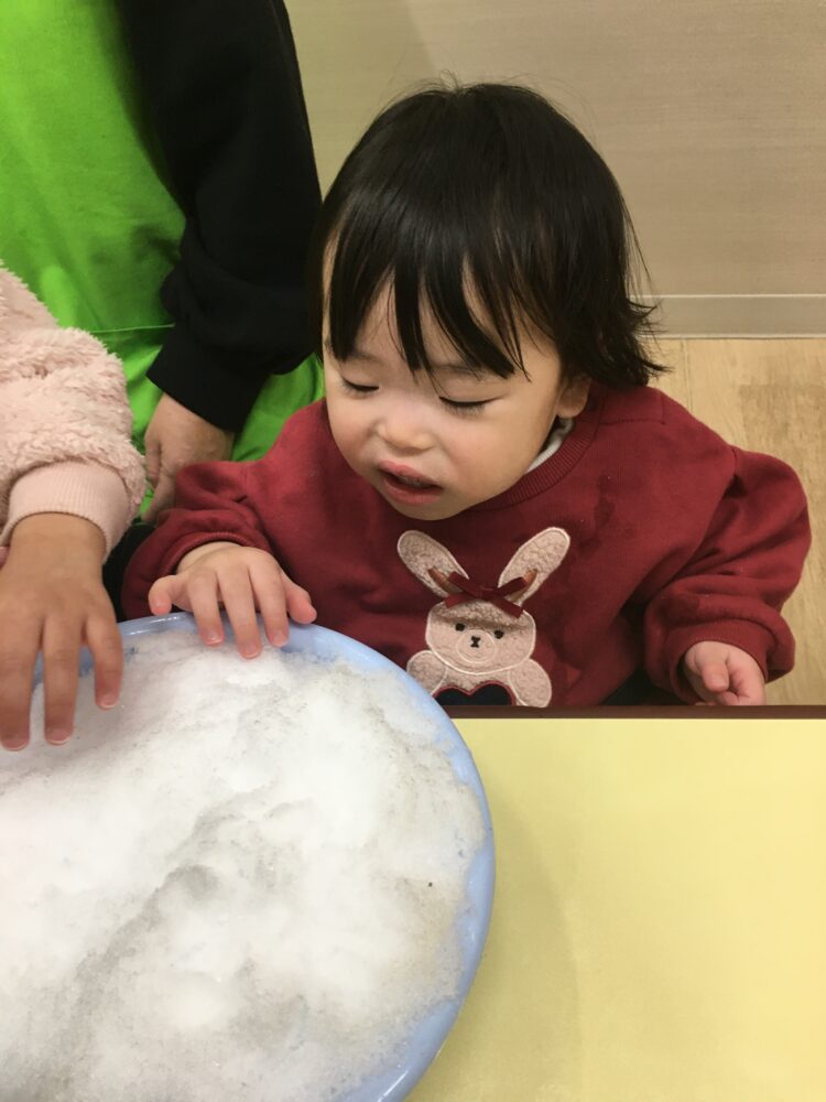 初めての雪に不安な気持ちを持っている子どももいましたが、恐る恐る手を出して触るチャレンジ精神を持っていました🍀