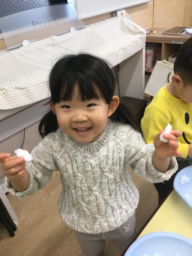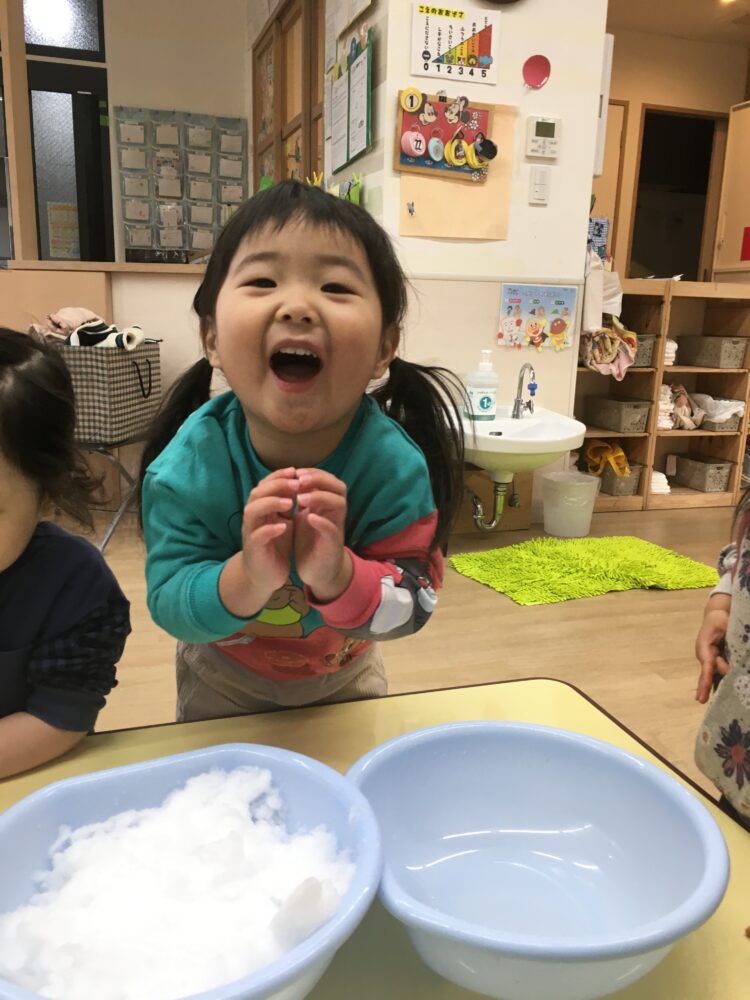 今日は雪が積もっていたので、室内に持ってきて雪遊びをしました😉⛄️