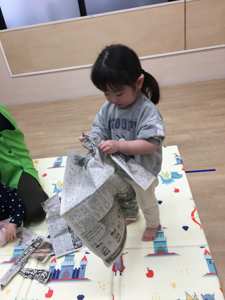 新聞紙を破いて落ち葉を作りました。さぁ、さつまいもを焼く準備です。
