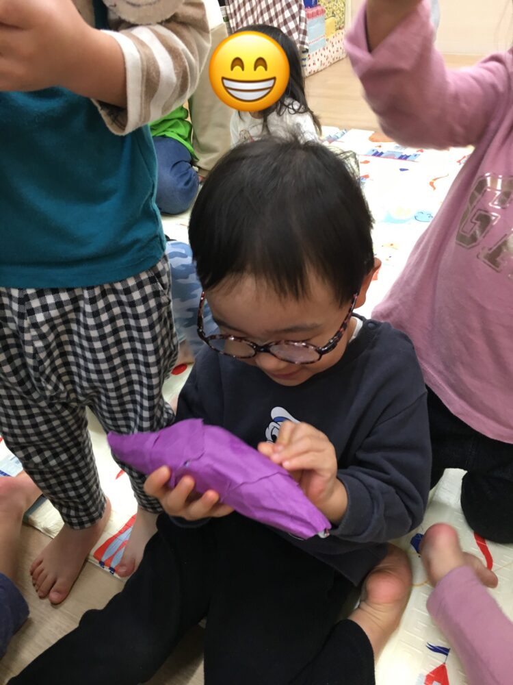 『やきいもグーチーパー』を歌いながら、焼き芋が出来るのを待ってます。