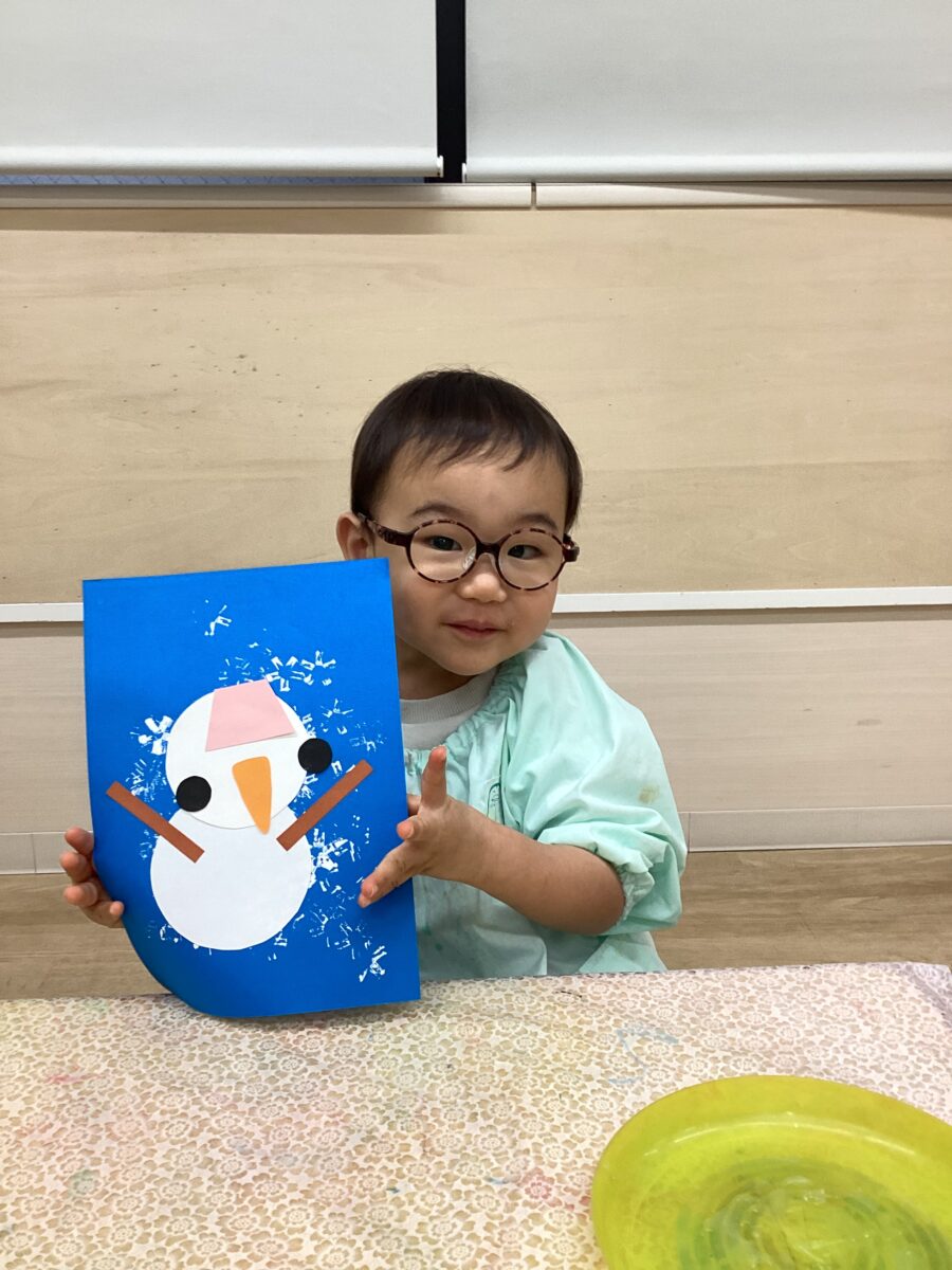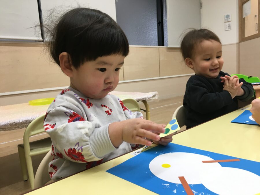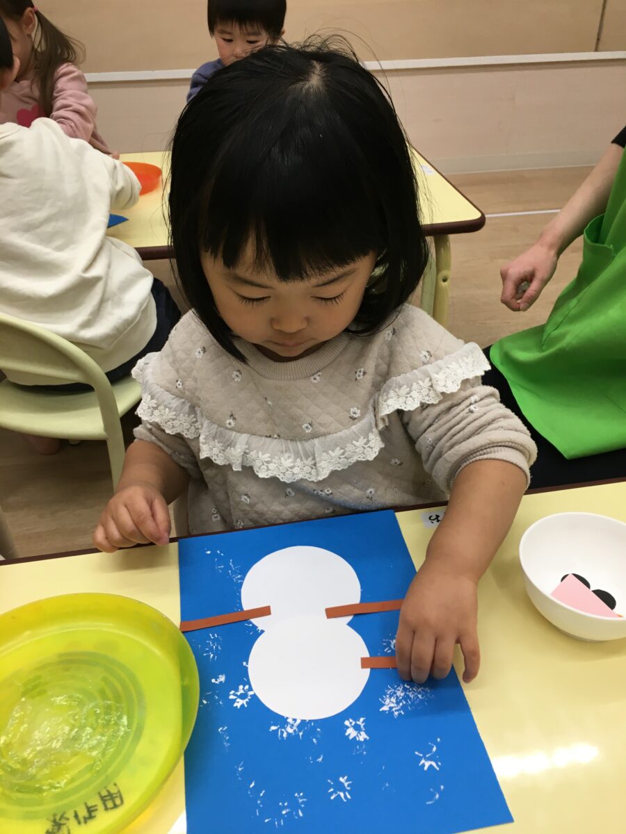 めろん組さんとばなな組さんは糊付けで、いちご組さんはシール貼りで雪だるまの製作遊びをしました⛄❄