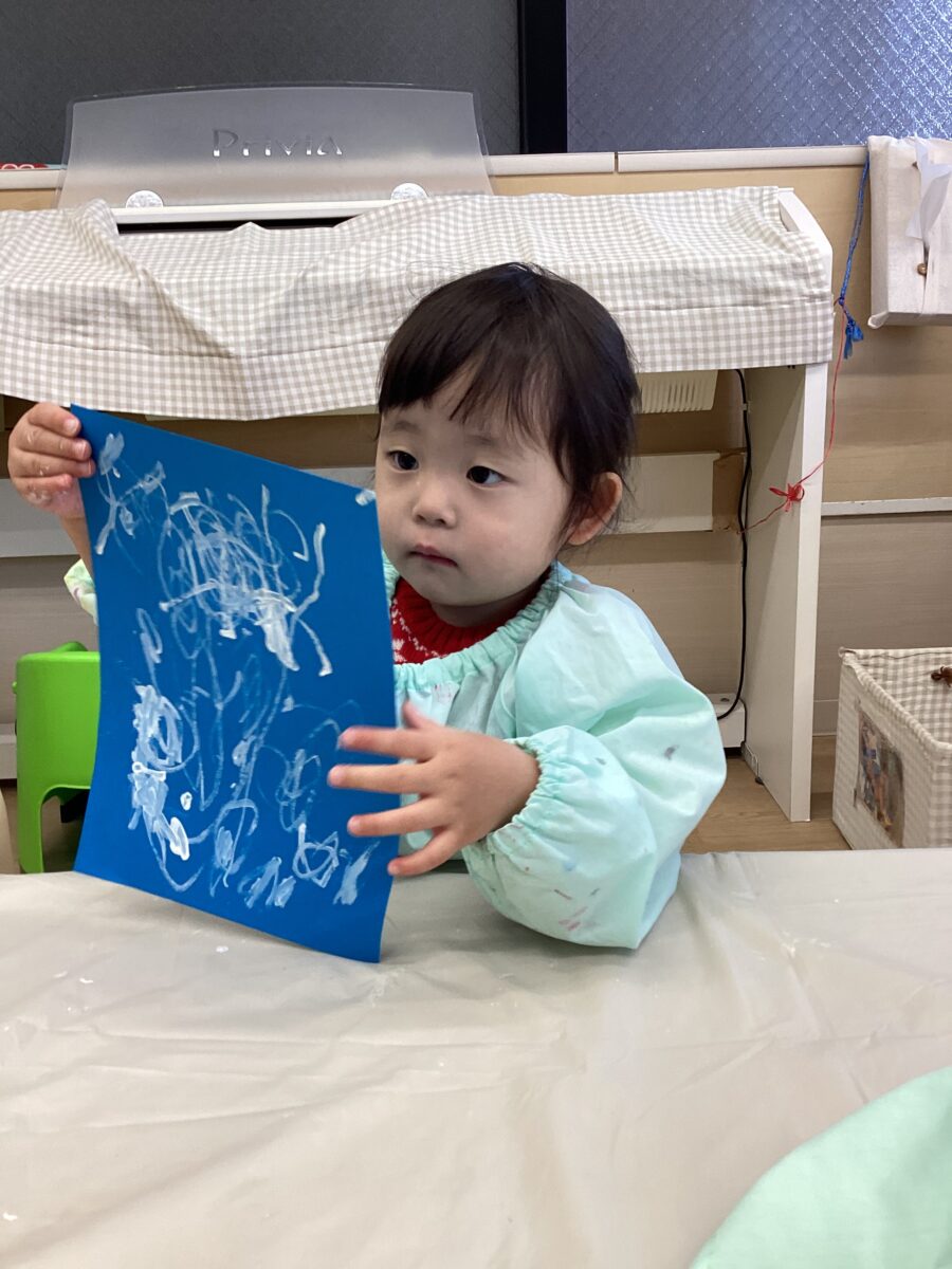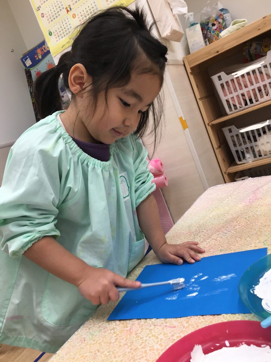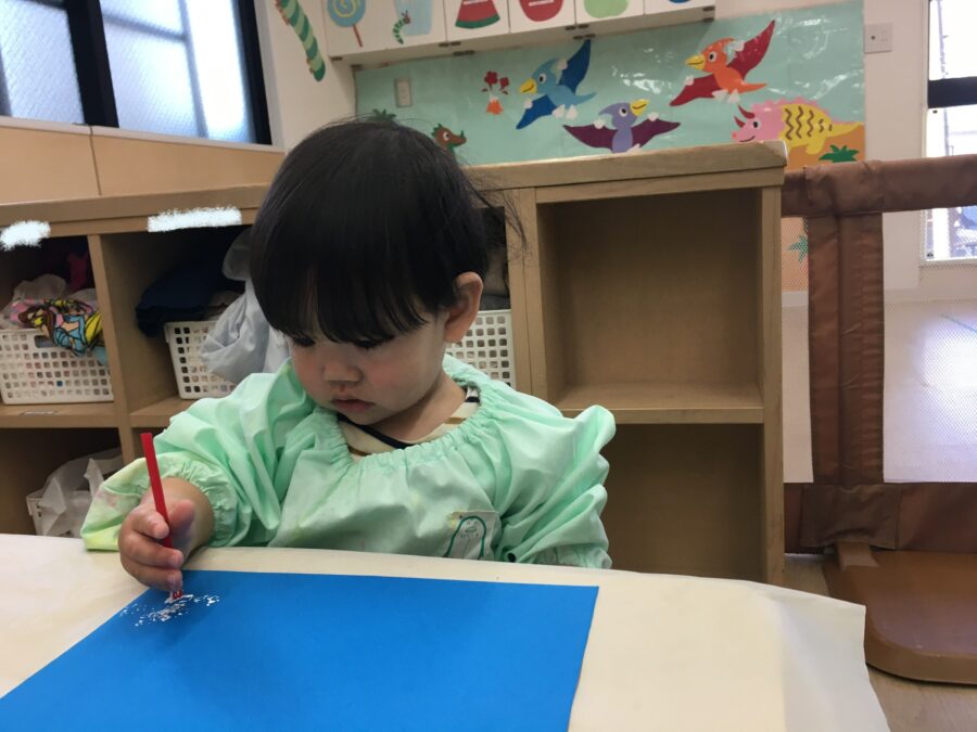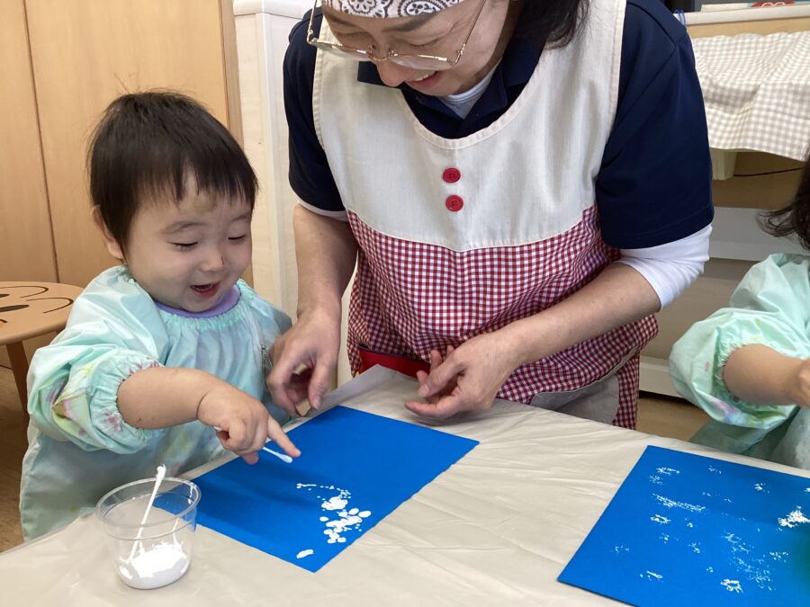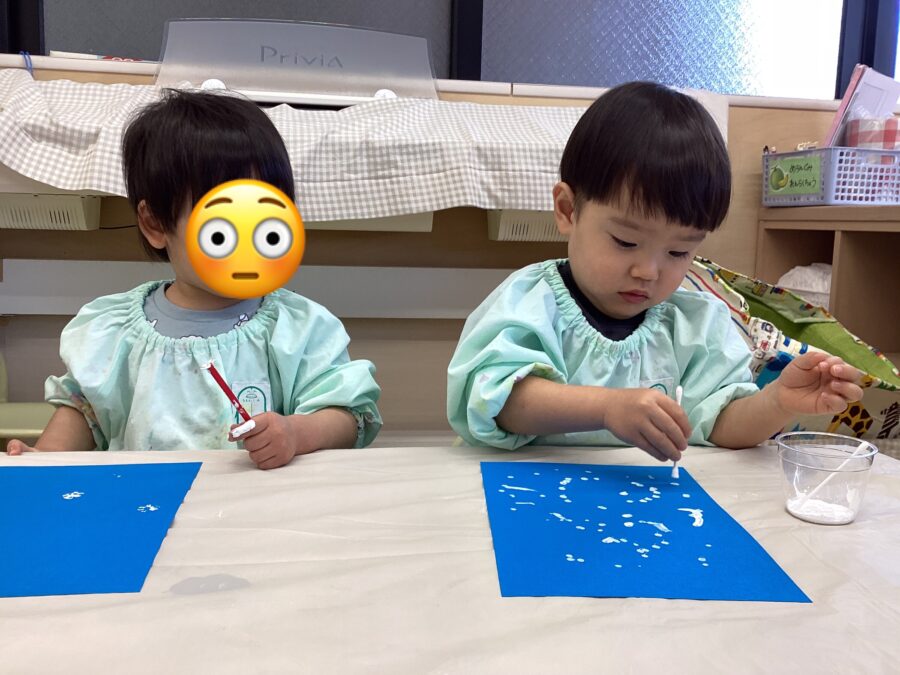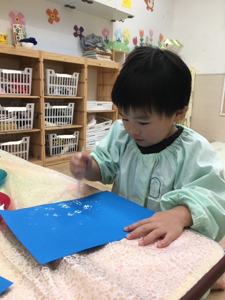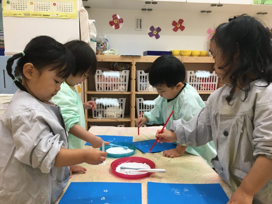 ストロースタンプや綿棒、歯ブラシを使って、思い思いに雪を降らせて楽しみました❄️