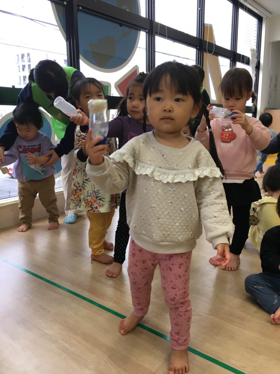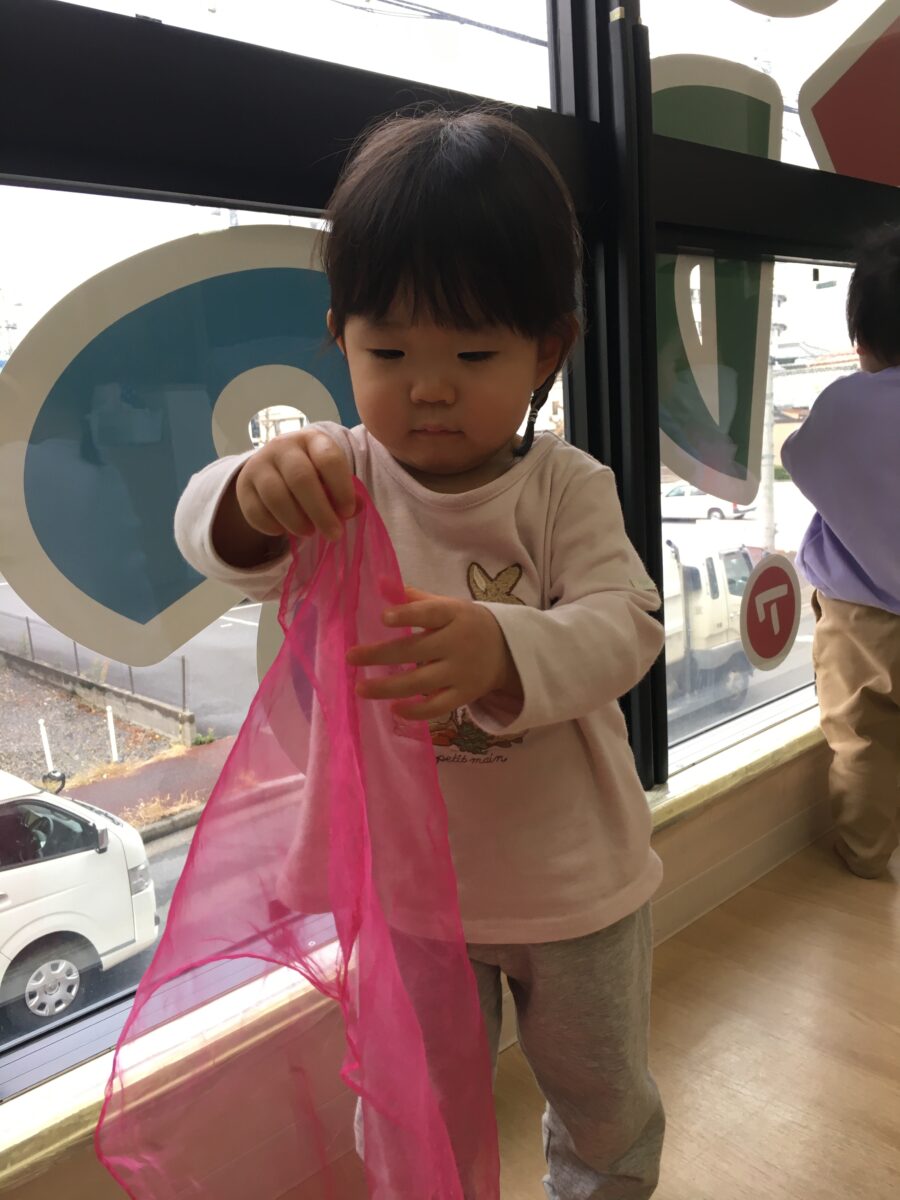 リトミックでは、シフォンスカーフやマラカスや鈴を使って音楽に合わせてリズム遊び🎶