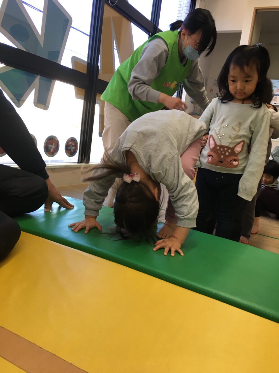 マットを中心とした内容で、でんぐり返し、後ろ回り、横回りをしました。
