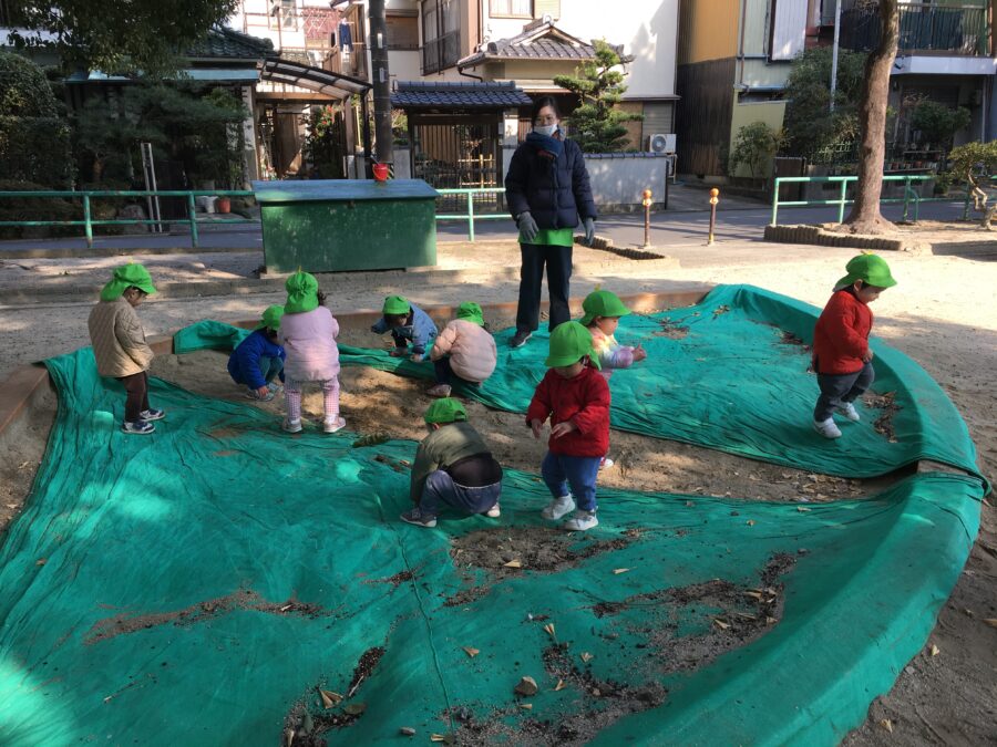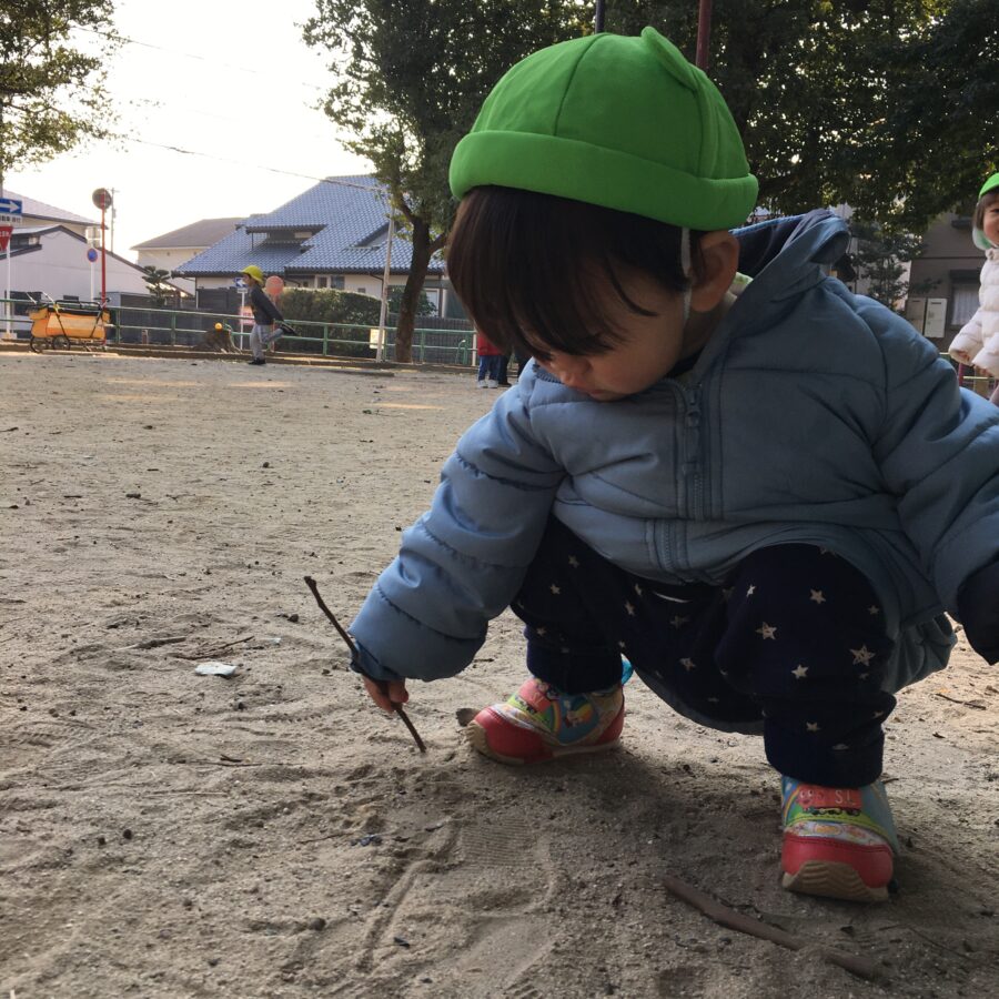 砂場に黒い木の実や松ぼっくりが沢山落ちていたので、ばなな組さんの殆どは木の実拾いに釘付けでした笑