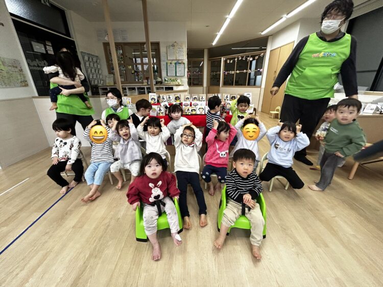 めろん組さんは、笛がなると、空いているところに滑り込むように座ったり、少しでも多く残りたい気持ちが前に出てフライングする子がちらほらいたりと、勝ちを意識する姿が見られました🤭