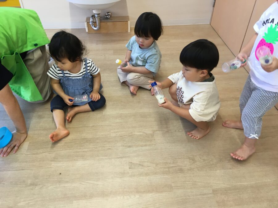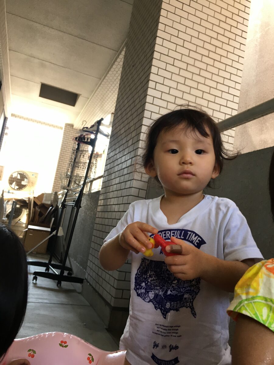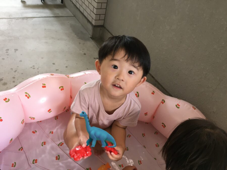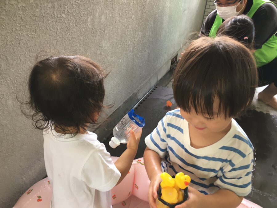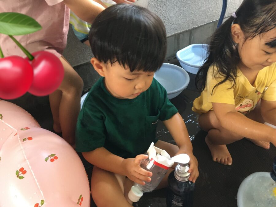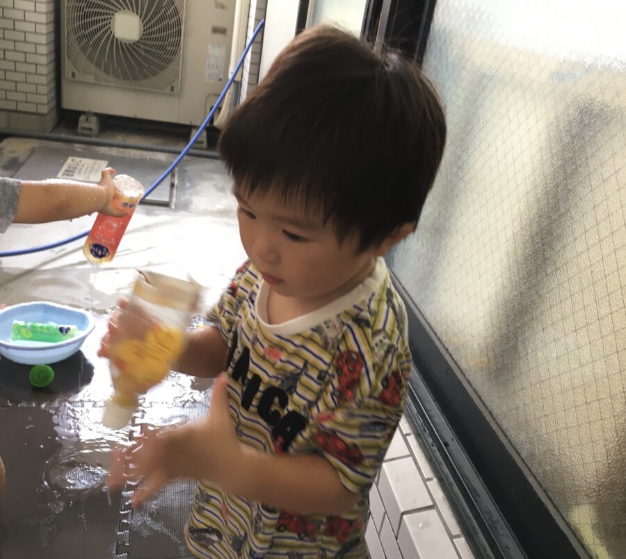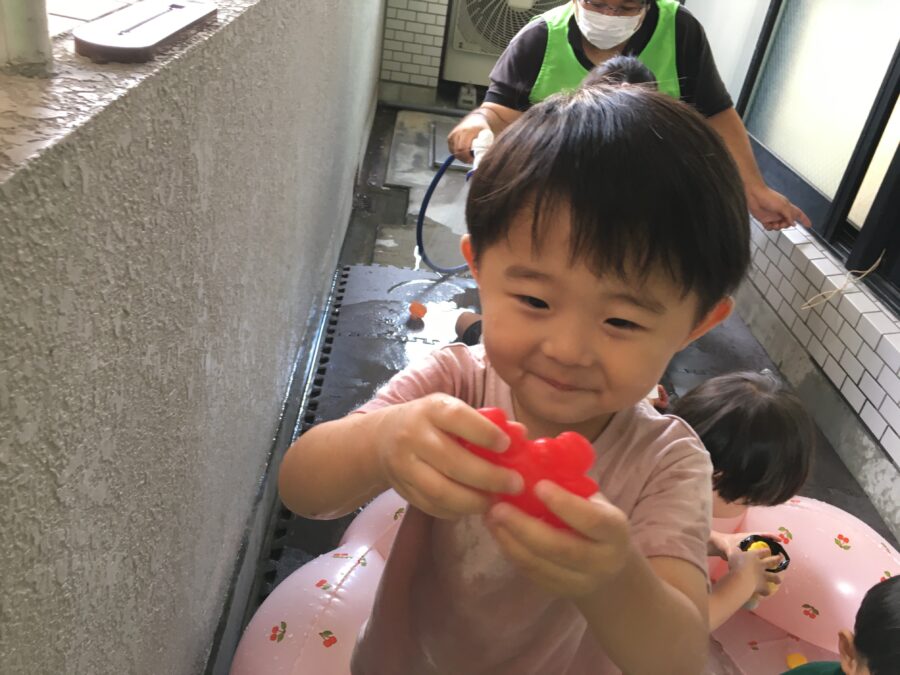 今日の水遊びでは、昨日と同様のシャボン玉と、おもちゃ遊びをしました😃