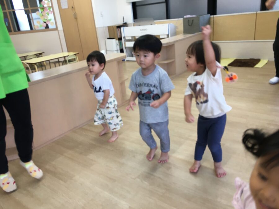 クイズの時に出てきたマラカスにみんな興味を持って、その後の自由遊びの時に、みんな楽しそうにマラカスを振っていました