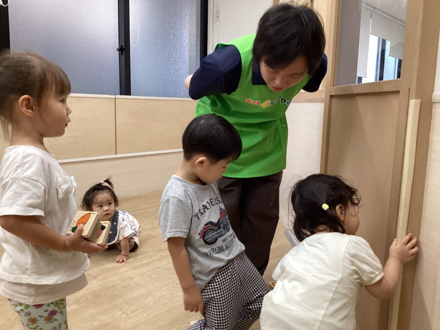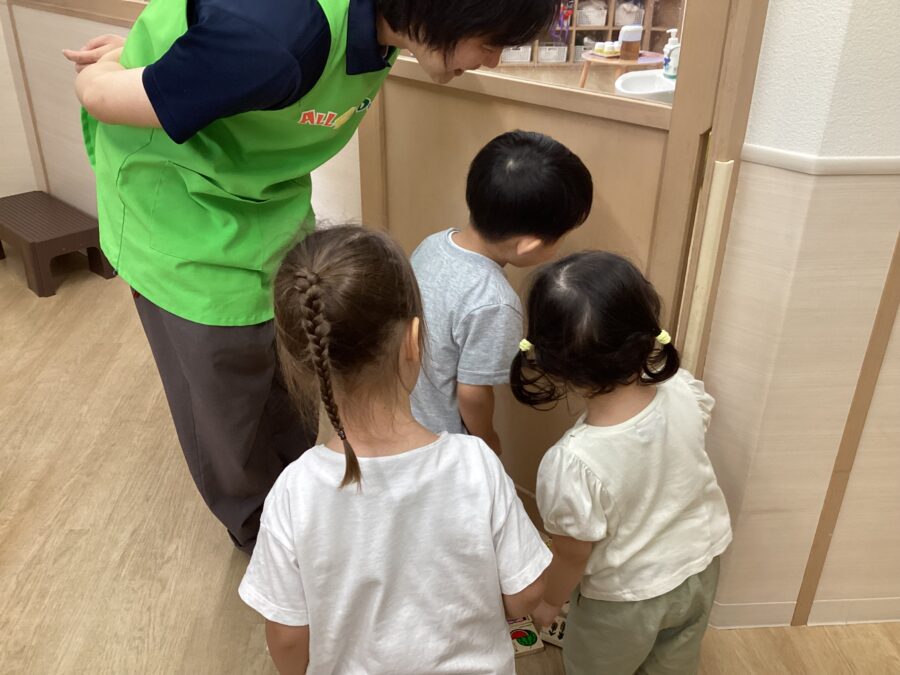窓を開けて遊んでいる様子を覗き込むと、ちょうどシャボン玉を飛ばしているところで、お部屋に少しシャボン玉が入ってきて喜ぶ子どもたちでした(笑)