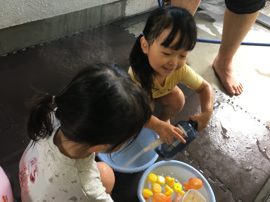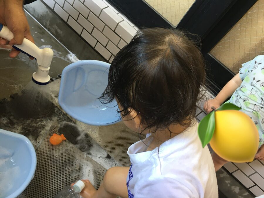 洗面器やジャンプーボトルに水を入れるとお友だちと一緒に体を洗ってさっぱり!