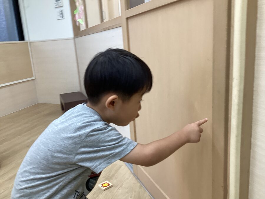 何かを見つけて、指差しをしているおともだちがいました。