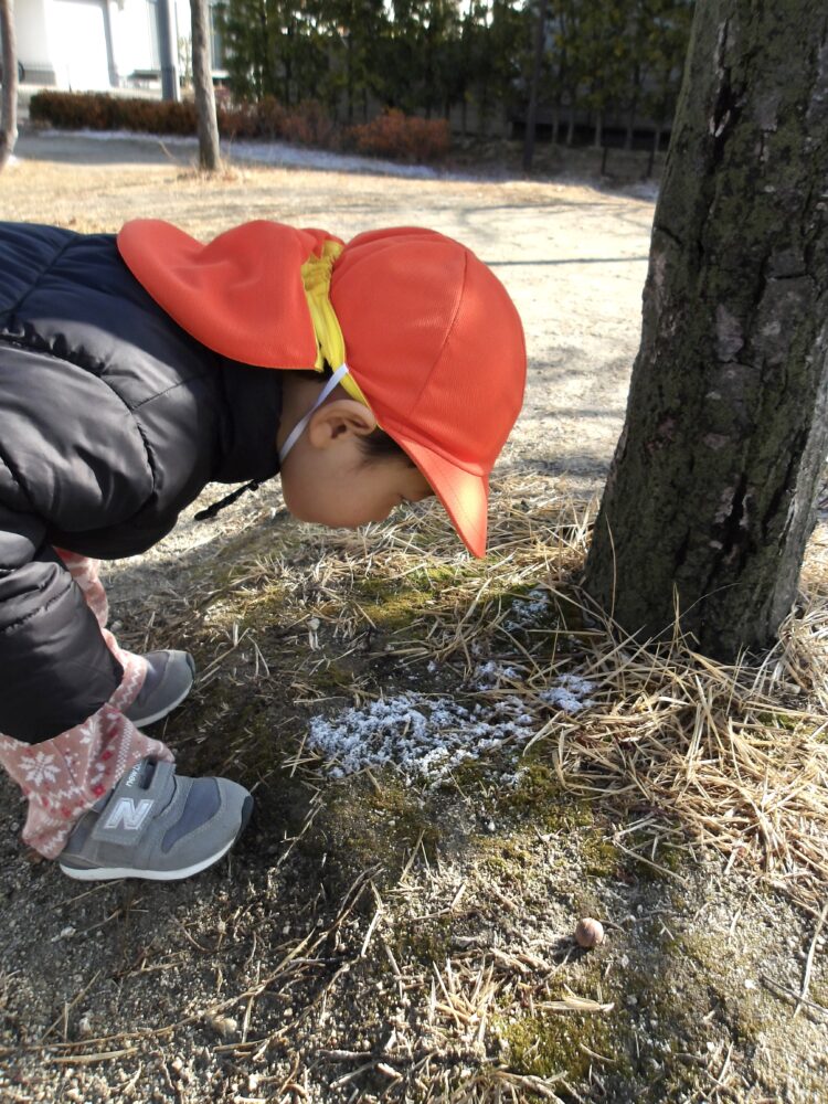 今日は少し遠めの公園に行きました。まだ雪が残る公園に嬉しそうな子どもたちです❄️少し触ってみたり、足で踏んだりして感触を楽しみましたよ😊