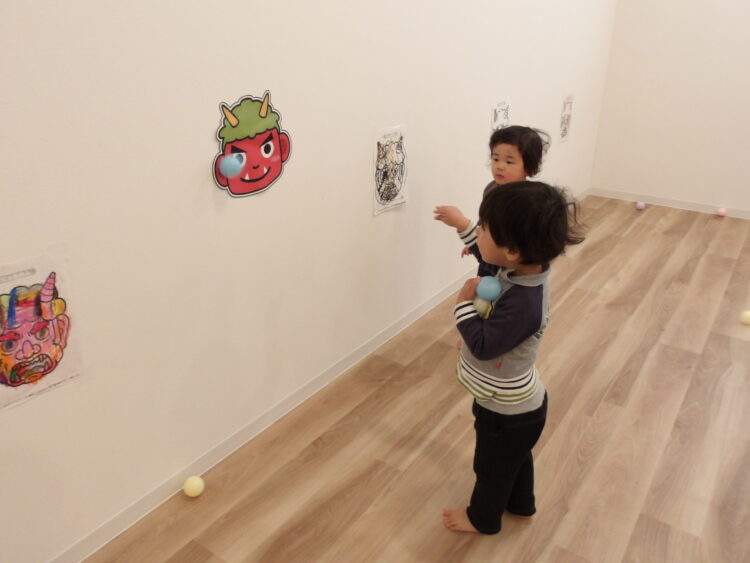個性的でカラフルな鬼に向かって「おにはそとー!ふくはうちー!」と、歌と同じように豆まきをしましたよ。