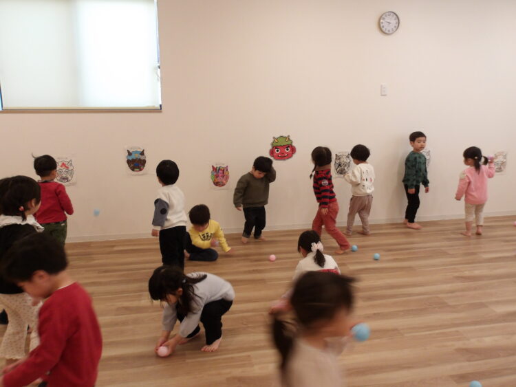 今日は節分ですね。朝の会で、みんなで元気に〈♪まめまき〉を歌いました。
