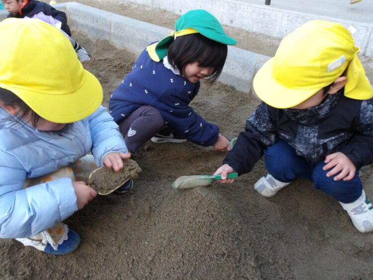 砂場では、みんなで協力して大きなお山を作っていました!