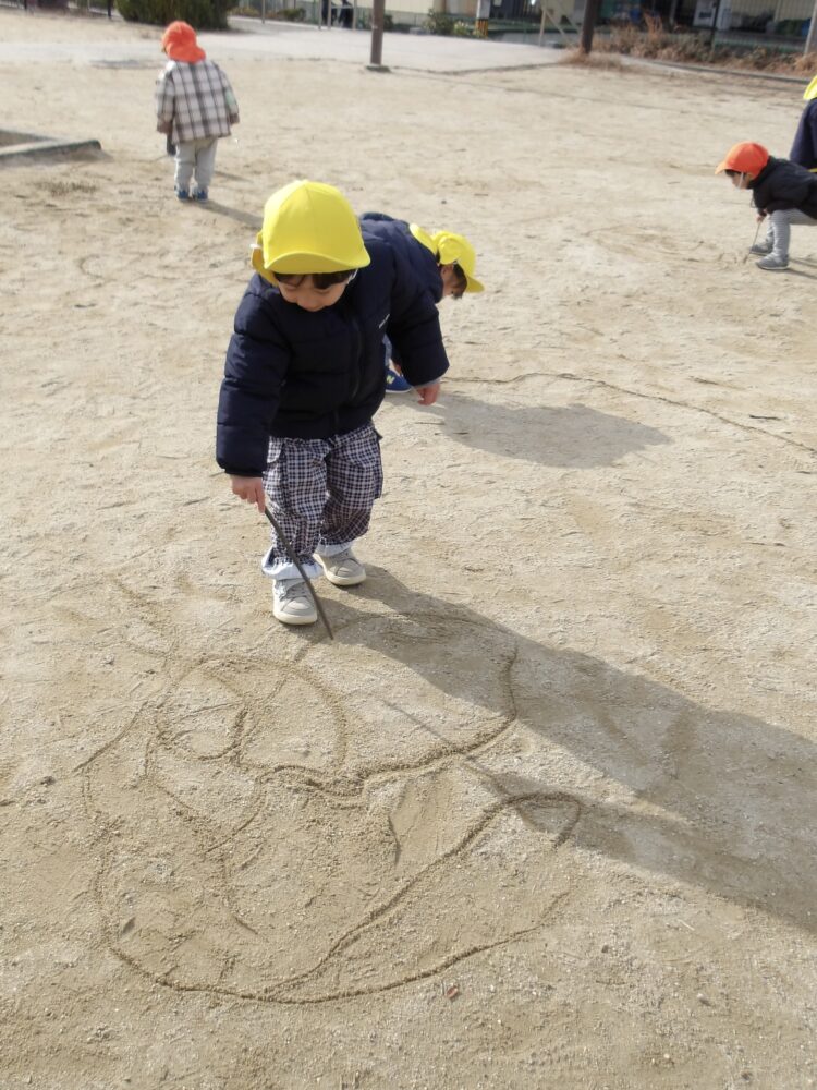 ちょうどいいサイズの木の棒が落ちていて、お絵描き大会が行われていましたよ。