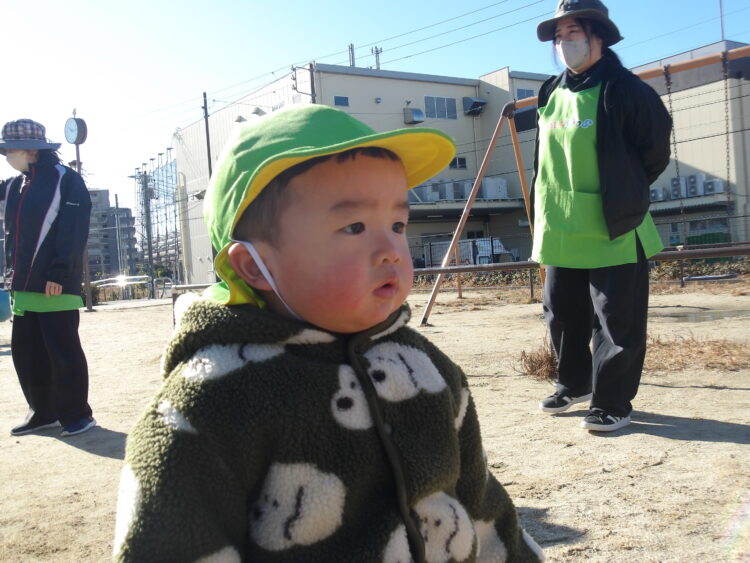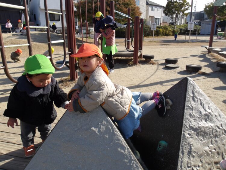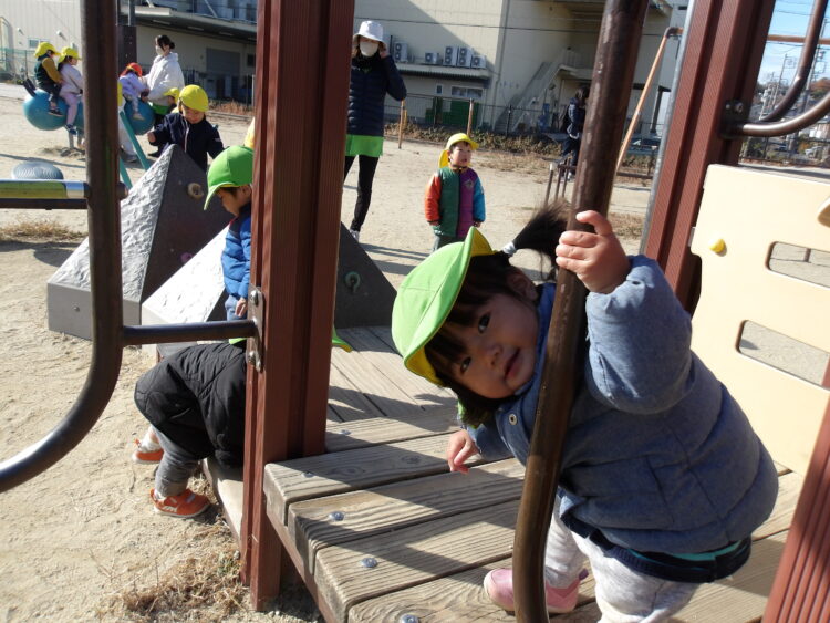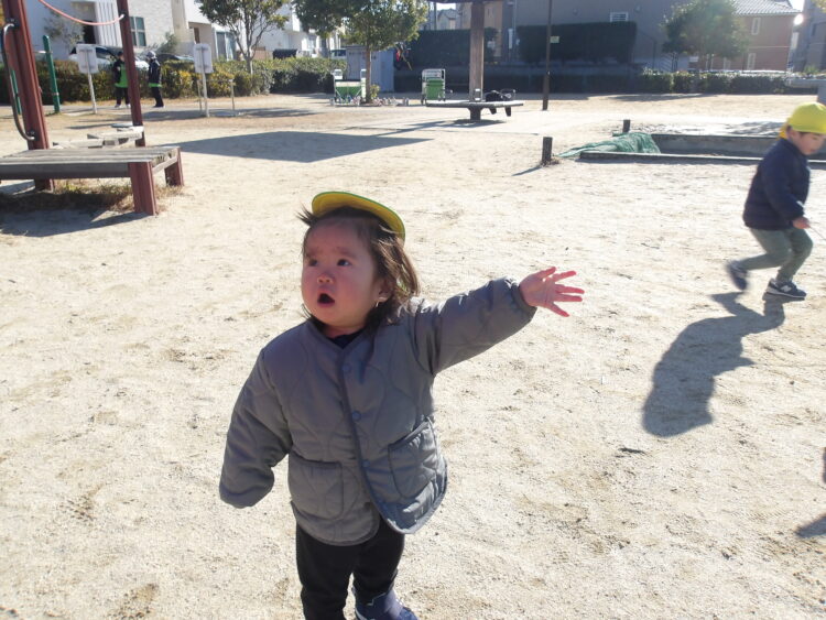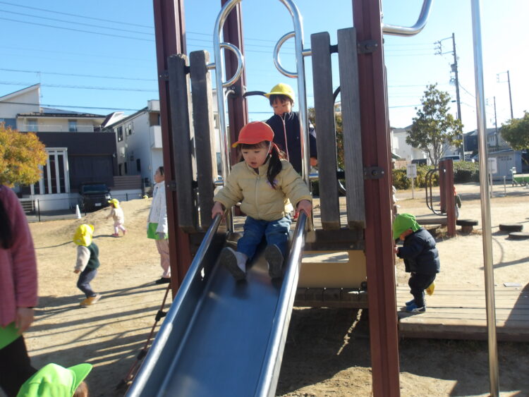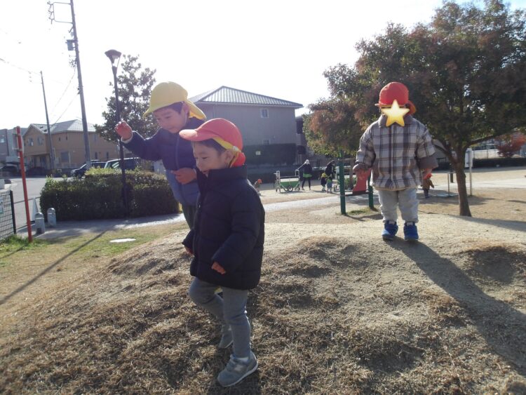 公園では、なかなかいつも一緒に遊ぶ機会のない保育者と追いかけっこをしたり、違うクラスのお友だちとあそびを共有する姿がありました。