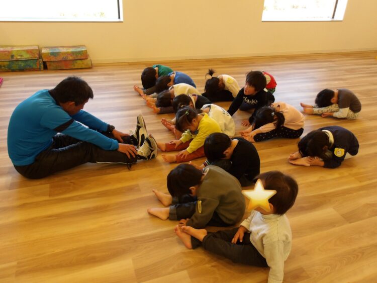 準備運動では、ペターと柔軟体操に挑戦!さすが身体の柔らかい子どもたち。とっても可愛らしいですね🥰