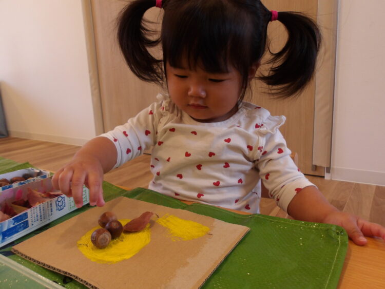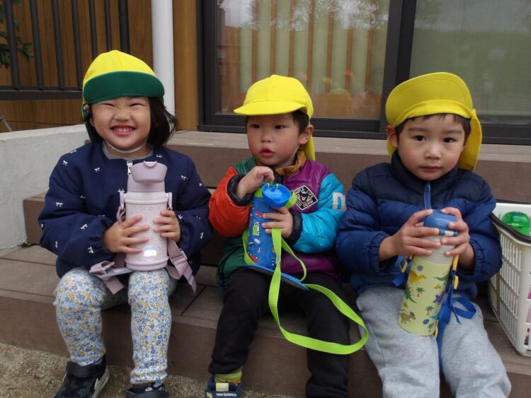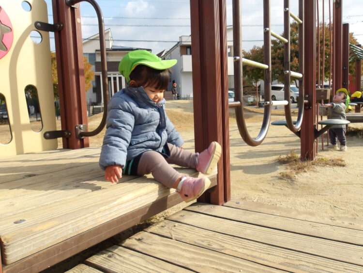 少し高めの段差に挑戦のひよこ組のお友だち。お尻をつけて座って慎重に足を下ろします。